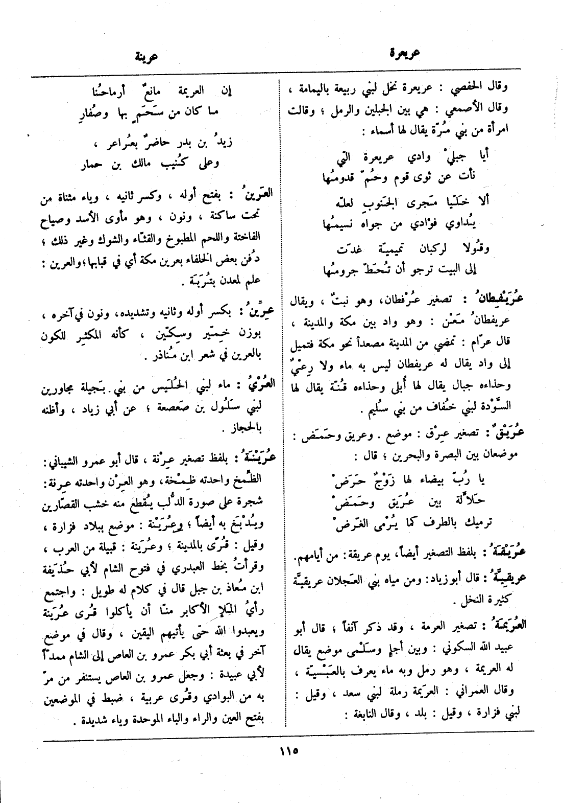وقال الحفصي: عريعرة نخل لبني ربيعة باليمامة، وقال الأصمعي: هي بين الجبلين والرمل، وقالت امرأة من بني مرّة يقال لها أسماء: