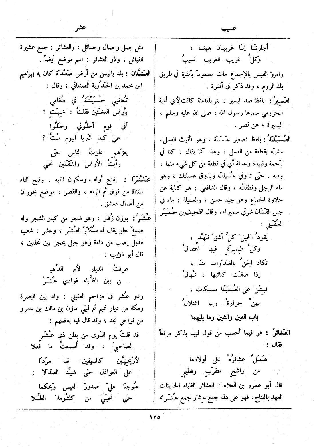 قال أبو عمرو بن العلاء: العشائر الظباء الحديثات العهد بالنتاج، فهو على هذا جمع عشار جمع عشراء مثل جمل وجمال وجمائل، والعشائر: جمع عشيرة للقبائل، وذو العشائر: اسم موضع أيضا.