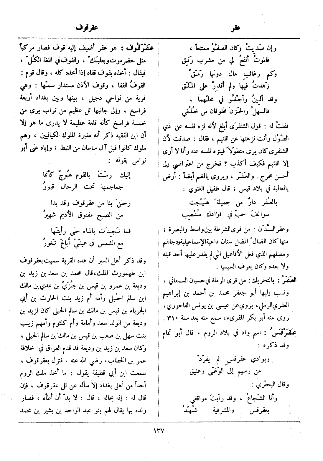 فقلت له: قول الشنفري أبلغ لأنه نزه نفسه عن ذي الطّول وأنت نزهتها عن اللئيم، فقال: صدقت لأن الشنفري كان يرى متطوّلا فينزه نفسه عنه وأنا لا أرى إلا اللئيم فكيف أكذب؟ فخرج من اعتراضي إلى أحسن مخرج. والعقر، ويروى بالضم أيضا: أرض بالعالية في بلاد قيس، قال طفيل الغنوي: