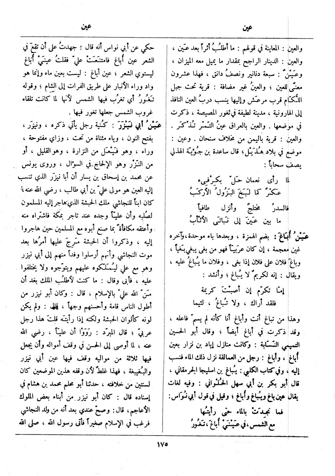 كنية رجل يأتي ذكره، ونيزر، بفتح النون، وياء مثناة من تحت، وزاي مفتوحة، وراء، وهو فيعل من النزارة، وهو القليل، أو من النّزر وهو الإلحاح في السؤال، وروى يونس عن محمد بن إسحاق بن يسار أن أبا نيزر الذي تنسب إليه العين هو مولى عليّ بن أبي طالب، رضي الله عنه، كان ابنا للنجاشي ملك الحبشة الذي هاجر إليه المسلمون لصلبه وأن عليّا وجده عند تاجر بمكة فاشتراه منه وأعتقه مكافأة بما صنع أبوه مع المسلمين حين هاجروا إليه، وذكروا أن الحبشة مرج عليها أمرها بعد موت النجاشي وأنهم أرسلوا وفدا منهم إلى أبي نيزر وهو مع علي ليملّكوه عليهم ويتوّجوه ولا يختلفوا عليه، فأبى وقال: ما كنت لأطلب الملك بعد أن من الله عليّ بالإسلام، قال: وكان أبو نيزر من أطول الناس قامة وأحسنهم وجها، قال: ولم يكن لونه كألوان الحبشة ولكنه إذا رأيته قلت هذا رجل عربيّ، قال المبرّد: رووا أن عليّا، رضي الله عنه، لما أوصى إلى الحسن في وقف أمواله وأن يجعل فيها ثلاثة من مواليه وقف فيها عين أبي نيزر والبغيبغة، فهذا غلط لأن وقفه هذين الموضعين كان لسنتين من خلافته، حدثنا أبو محلم محمد بن هشام في إسناده قال: كان أبو نيزر من أبناء بعض الملوك الأعاجم، قال: وصحّ عندي بعد أنه من ولد النجاشي فرغب في الإسلام صغيرا فأتى رسول الله، صلى الله