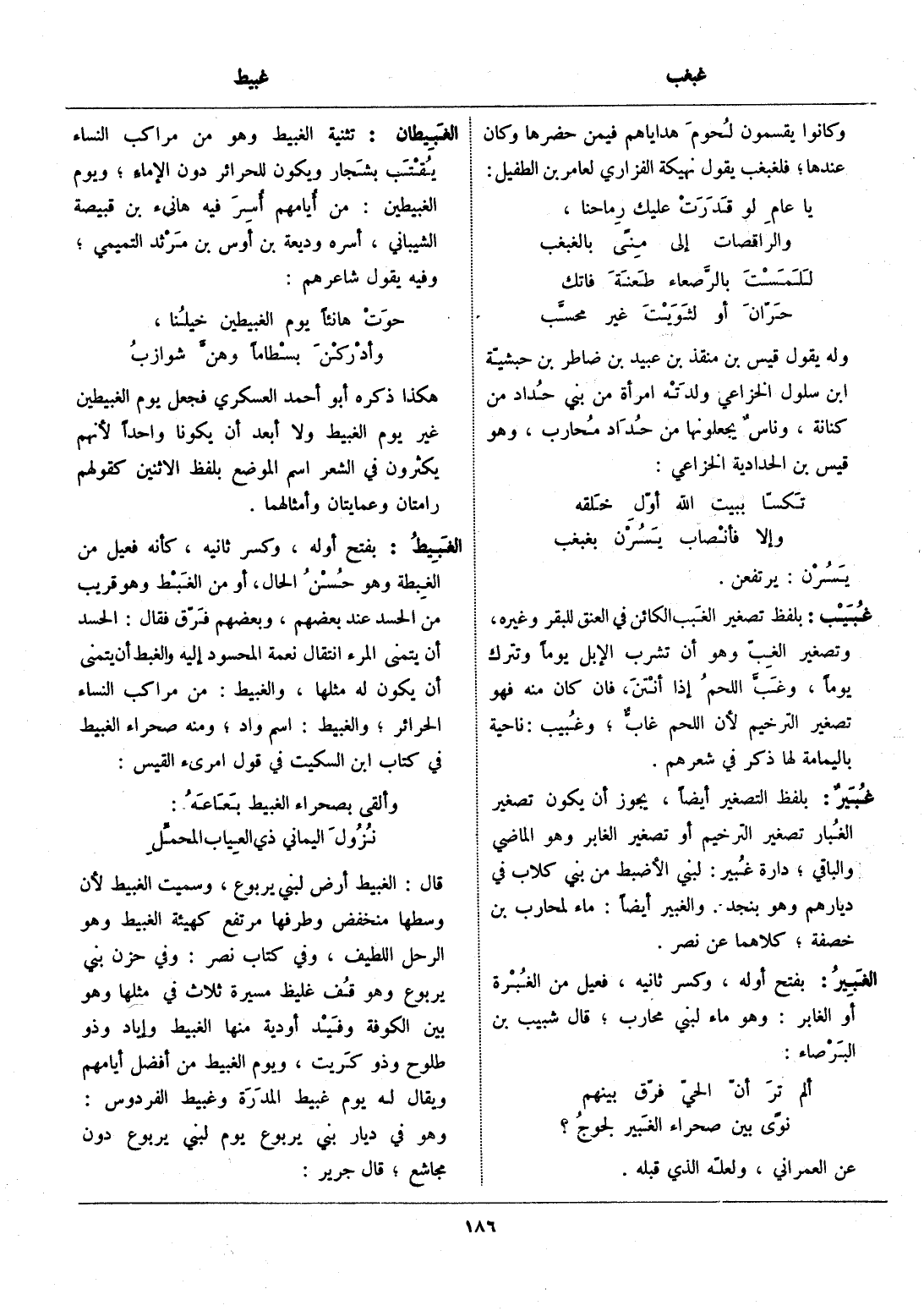هكذا ذكره أبو أحمد العسكري فجعل يوم الغبيطين غير يوم الغبيط ولا أبعد أن يكونا واحدا لأنهم يكثرون في الشعر اسم الموضع بلفظ الاثنين كقولهم رامتان وعمايتان وأمثالهما.