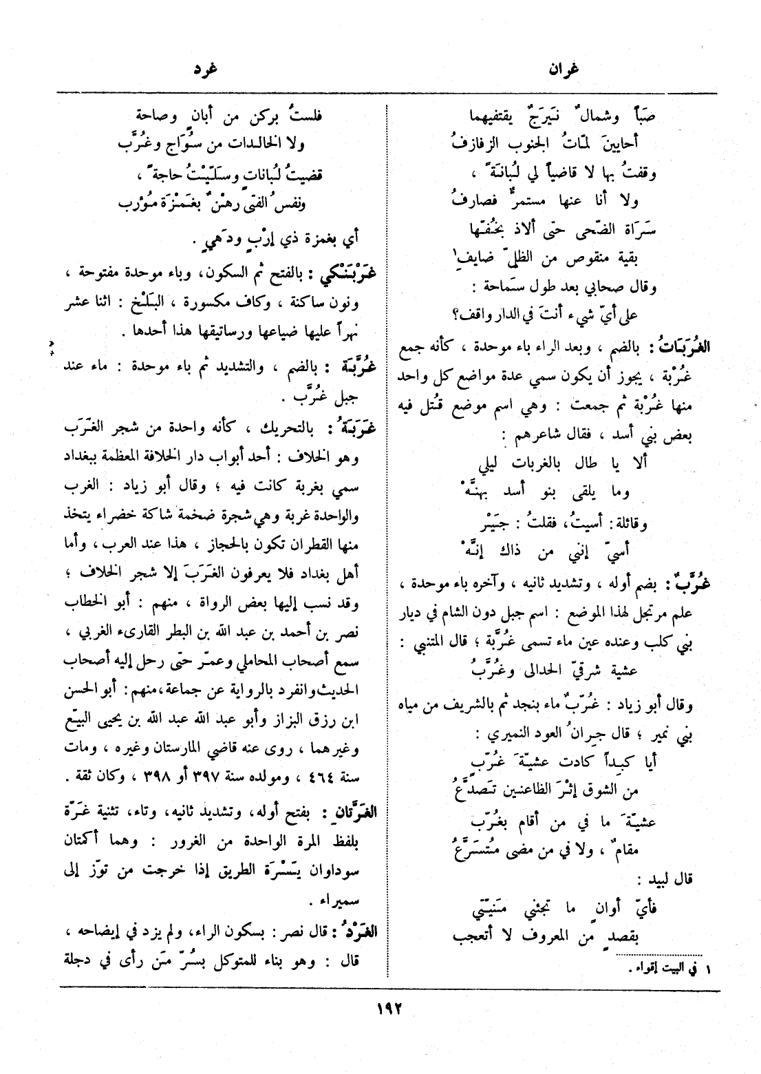 بالتحريك، كأنه واحدة من شجر الغرب وهو الخلاف: أحد أبواب دار الخلافة المعظمة ببغداد سمي بغربة كانت فيه، وقال أبو زياد: الغرب والواحدة غربة وهي شجرة ضخمة شاكة خضراء يتخذ منها القطران تكون بالحجاز، هذا عند العرب، وأما أهل بغداد فلا يعرفون الغرب إلا شجر الخلاف، وقد نسب إليها بعض الرواة، منهم: أبو الخطاب نصر بن أحمد بن عبد الله بن البطر القارئ الغربي، سمع أصحاب المحاملي وعمّر حتى رحل إليه أصحاب الحديث وانفرد بالرواية عن جماعة، منهم: أبو الحسن ابن رزق البزاز وأبو عبد الله عبد الله بن يحيى البيّع وغيرهما، روى عنه قاضي المارستان وغيره، ومات سنة 464، ومولده سنة 397 أو 398، وكان ثقة.