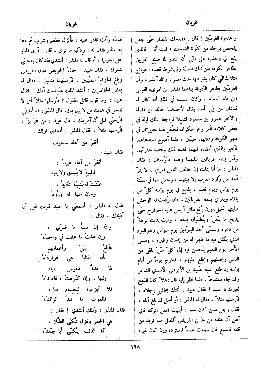 واهدموا الغريّين! قال: فضحك القصار حتى جعل يفحص برجله من كثرة الضحك، قلت أنا: فالذي يقع لي ويغلب على ظني أن المنذر لما صنع الغريين بظاهر الكوفة سنّ تلك السنّة ولم يشرط قضاء الحوائج الثلاث التي كان يشرطها ملك مصر، والله أعلم، وأن الغريّين بظاهر الكوفة بناهما المنذر بن امرئ القيس ابن ماء السماء، وكان السبب في ذلك أنه كان له نديمان من بني أسد يقال لأحدهما خالد بن نضلة والآخر عمرو بن مسعود فثملا فراجعا الملك ليلة في بعض كلامه فأمر وهو سكران فحفر لهما حفيرتان في ظهر الكوفة ودفنهما حيّين، فلما أصبح استدعاهما فأخبر بالذي أمضاه فيهما فغمه ذلك وقصد حفرتهما وأمر ببناء طربالين عليهما وهما صومعتان، فقال المنذر: ما أنا بملك إن خالف الناس امري، لا يمرّ أحد من وفود العرب إلا بينهما، وجعل لهما في السّنة يوم بؤس ويوم نعيم، يذبح في يوم بؤسه كلّ من يلقاه ويغري بدمه الطربالين، فان رفعت له الوحش طلبتها الخيل، وإن رفع طائر أرسل عليه الجوارح حتى يذبح ما يعنّ ويطليان بدمه، ولبث بذلك برهة من دهره وسمّى أحد اليومين يوم البؤس وهو اليوم الذي يقتل فيه ما ظهر له من إنسان وغيره، وسمى الآخر يوم النعيم يحسن فيه إلى كلّ من يلقى من الناس ويحملهم ويخلع عليهم، فخرج يوما من أيام بؤسه إذ طلع عليه عبيد بن الأبرص الأسدي الشاعر وقد جاء ممتدحا، فلما نظر إليه قال: هلّا كان الذبح لغيرك يا عبيد! فقال عبيد: أتتك بحائن رجلاه، فأرسلها مثلا، فقال له المنذر: أو أجل قد بلغ أناه، فقال رجل ممن كان معه: أبيت اللعن اتركه فاني أظن أن عنده من حسن القريض أفضل مما تريد من قتله فاسمع فان سمعت حسنا فاستزده وإن كان غيره قتلته وأنت قادر عليه، فأنزل فطعم وشرب ثم دعا به المنذر فقال له: زدنيه ما ترى، قال: أرى المنايا على الحوايا، ثم قال له المنذر: أنشدني فقد كان يعجبني شعرك، فقال عبيد: حال الجريض دون القريض وبلغ الحزام الطبّيين، فأرسلهما مثلين، فقال له بعض الحاضرين: أنشد الملك هبلتك أمك! فقال عبيد: وما قول قائل مقتول؟ فأرسلها مثلا أي لا تدخل في همك من لا يهتم بك، قال المنذر: قد أمللتني فأرحني قبل أن آمر بك، قال عبيد: من عزّ بزّ، فأرسلها مثلا، فقال المنذر: أنشدني قولك: