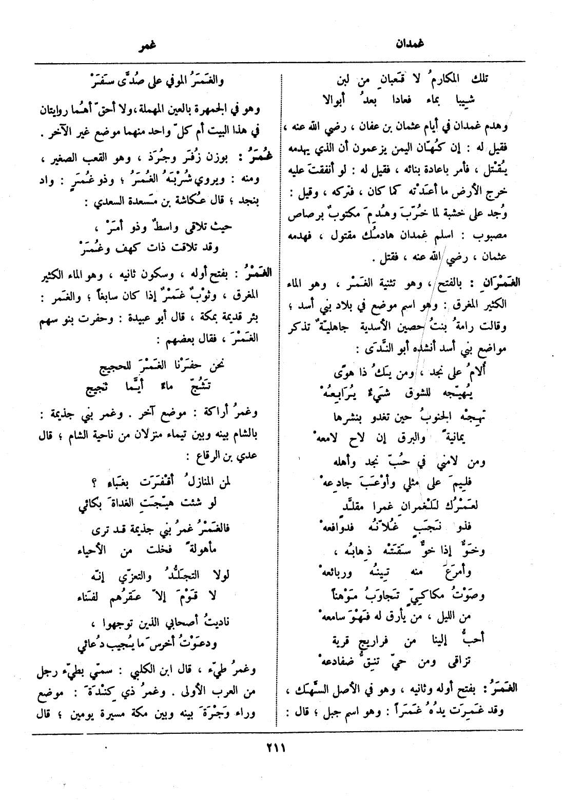 بالفتح، وهو تثنية الغمر، وهو الماء الكثير المغرق: وهو اسم موضع في بلاد بني أسد، وقالت رامة بنت حصين الأسدية جاهليّة تذكر مواضع بني أسد أنشده أبو النّدى: