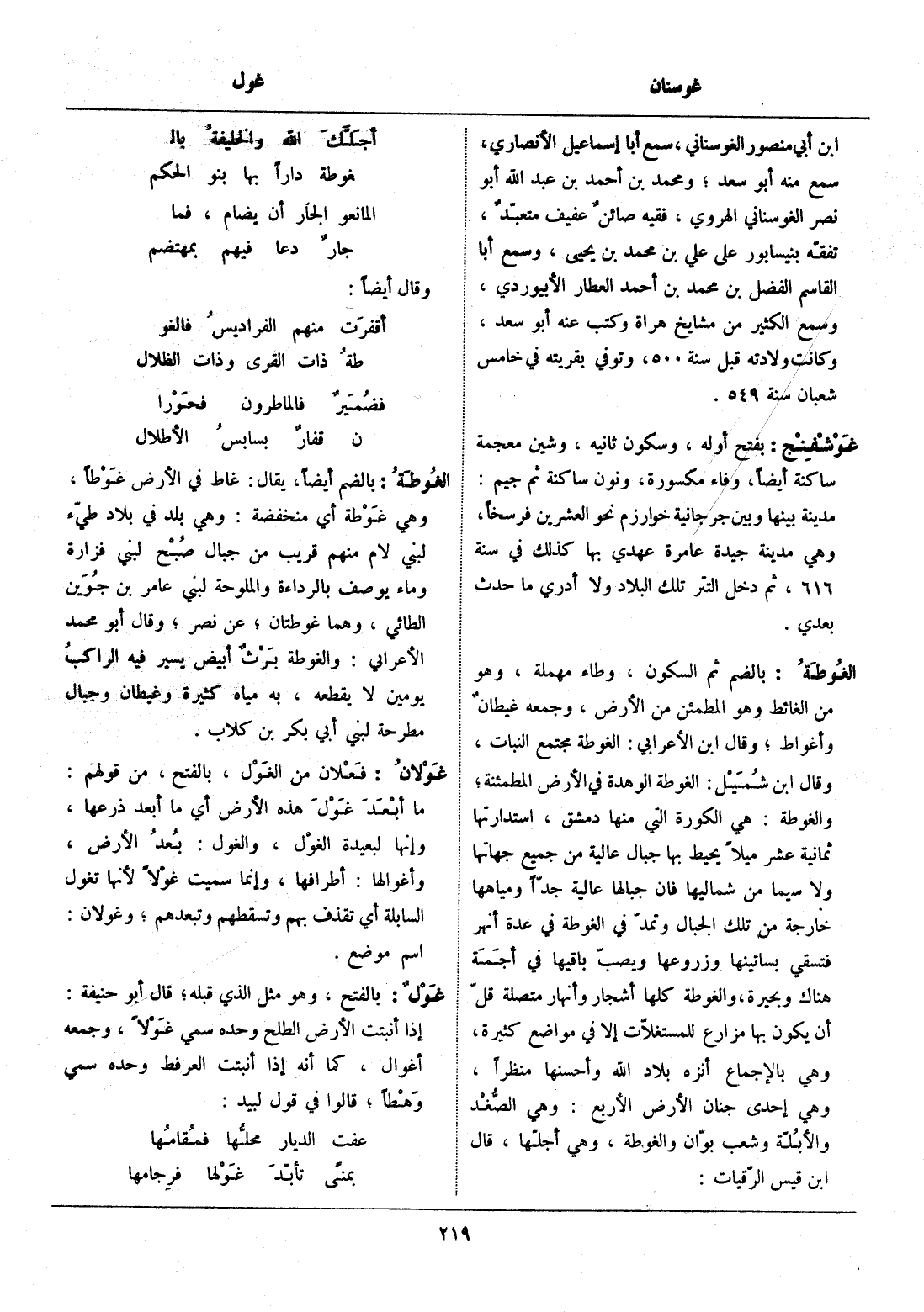 ما أبعد غول هذه الأرض أي ما أبعد ذرعها، وإنها لبعيدة الغول، والغول: بعد الأرض، وأغوالها: أطرافها، وإنما سميت غولا لأنها تغول السابلة أي تقذف بهم وتسقطهم وتبعدهم، وغولان:
