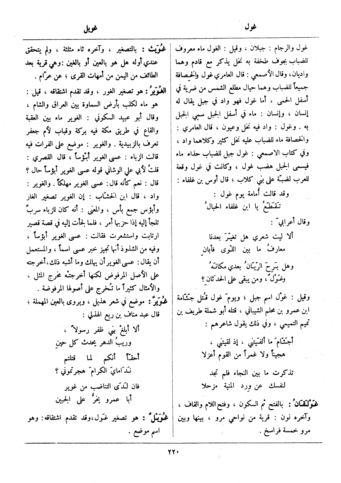 غول والرجام: جبلان، وقيل: الغول ماء معروف للضباب بجوف طخفة به نخل يذكر مع قادم وهما واديان، وقال الأصمعي: قال العامري غول والخصافة جميعا للضباب وهما حيال مطلع الشمس من ضرية في أسفل الحمى، أما غول فهو واد في جبل يقال له إنسان، وإنسان: ماء في أسفل الجبل سمي الجبل به. وغول: واد فيه نخل وعيون، قال العامري: