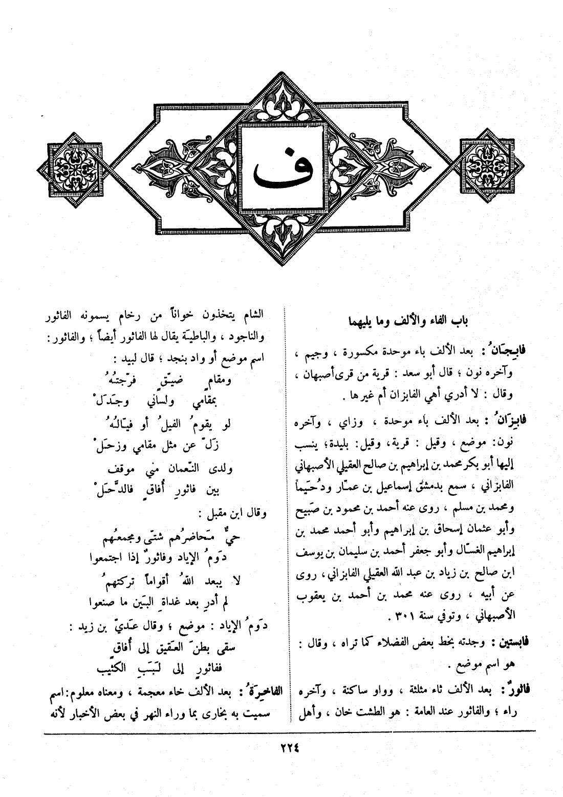 بعد الألف ثاء مثلثة، وواو ساكنة، وآخره راء، والفاثور عند العامة: هو الطشت خان، وأهل الشام يتخذون خوانا من رخام يسمونه الفاثور والناجود، والباطية يقال لها الفاثور أيضا، والفاثور: