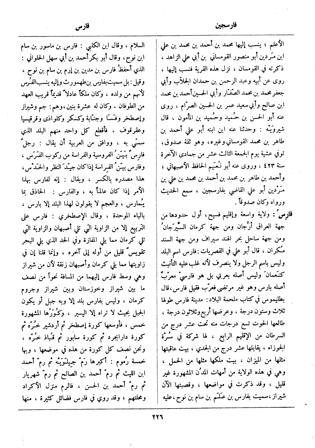 ولاية واسعة وإقليم فسيح، أول حدودها من جهة العراق أرّجان ومن جهة كرمان السّيرجان ومن جهة ساحل بحر الهند سيراف ومن جهة السند مكران، قال أبو علي في القصريات: فارس اسم البلد وليس باسم الرجل ولا ينصرف لأنه غلب عليه التأنيث كنعمان وليس أصله بعربي بل هو فارسيّ معرّب أصله بارس وهو غير مرتضى فعرّب فقيل فارس، قال بطليموس في كتاب ملحمة البلاد: مدينة فارس طولها ثلاث وستون درجة، وعرضها أربع وثلاثون درجة، طالعها الحوت تسع درجات منه تحت عشر درج من السرطان من الإقليم الرابع، لها شركة في سرّة الجوزاء، يقابلها عشر درج من الجدي، بيت عاقبتها مثلها من الميزان، بيت ملكها مثلها من الحمل، وهي في هذه الولاية من أمهات المدن المشهورة غير قليل، وقد ذكرت في مواضعها، وقصبتها الآن شيراز، سميت بفارس بن علم بن سام بن نوح، عليه السلام، وقال ابن الكلبي: فارس بن ماسور بن سام ابن نوح، وقال أبو بكر أحمد بن أبي سهل الحلواني: