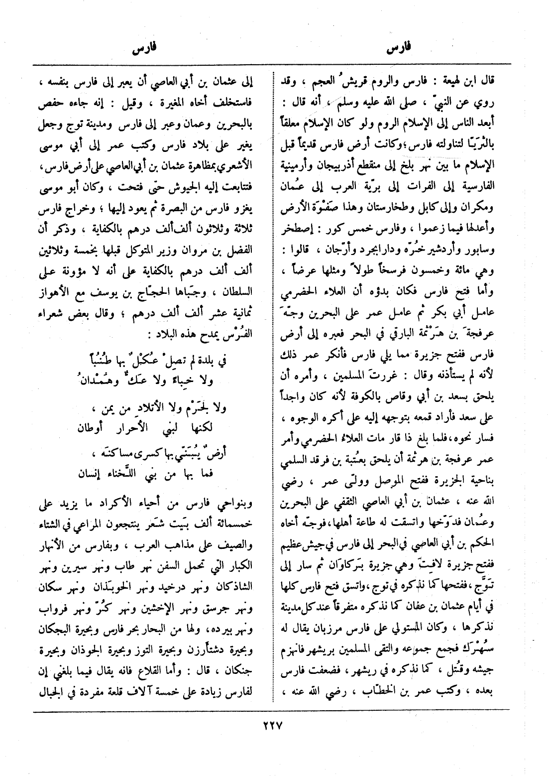وهي مائة وخمسون فرسخا طولا ومثلها عرضا، وأما فتح فارس فكان بدؤه أن العلاء الحضرمي عامل أبي بكر ثم عامل عمر على البحرين وجّه عرفجة بن هرثمة البارقي في البحر فعبره إلى أرض فارس ففتح جزيرة مما يلي فارس فأنكر عمر ذلك لأنه لم يستأذنه وقال: غررت المسلمين، وأمره أن يلحق بسعد بن أبي وقاص بالكوفة لأنه كان واحدا على سعد فأراد قمعه بتوجهه إليه على أكره الوجوه، فسار نحوه، فلما بلغ ذا قار مات العلاء الحضرمي وأمر عمر عرفجة بن هرثمة أن يلحق بعتبة بن فرقد السلمي بناحية الجزيرة ففتح الموصل وولّى عمر، رضي الله عنه، عثمان بن أبي العاصي الثقفي على البحرين وعمان فدوّخها واتسقت له طاعة أهلها، فوجّه أخاه الحكم بن أبي العاصي في البحر إلى فارس في جيش عظيم ففتح جزيرة لافت وهي جزيرة بركاوان ثم سار إلى توّج، ففتحها كما نذكره في توج، واتسق فتح فارس كلها في أيام عثمان بن عفان كما نذكره متفرقا عند كل مدينة نذكرها، وكان المستولي على فارس مرزبان يقال له سهرك فجمع جموعه والتقى المسلمين بريشهر فانهزم جيشه وقتل، كما نذكره في ريشهر، فضعفت فارس بعده، وكتب عمر بن الخطّاب، رضي الله عنه، إلى عثمان بن أبي العاصي أن يعبر إلى فارس بنفسه، فاستخلف أخاه المغيرة، وقيل: إنه جاءه حفص بالبحرين وعمان وعبر إلى فارس ومدينة توج وجعل يغير على بلاد فارس وكتب عمر إلى أبي موسى الأشعري بمظاهرة عثمان بن أبي العاصي على أرض فارس، فتتابعت إليه الجيوش حتى فتحت، وكان أبو موسى يغزو فارس من البصرة ثم يعود إليها، وخراج فارس ثلاثة وثلاثون ألف ألف درهم بالكفاية، وذكر أن الفضل بن مروان وزير المتوكل قبلها بخمسة وثلاثين ألف ألف درهم بالكفاية على أنه لا مؤونة على السلطان، وجباها الحجّاج بن يوسف مع الأهواز ثمانية عشر ألف ألف درهم، وقال بعض شعراء الفرس يمدح هذه البلاد: