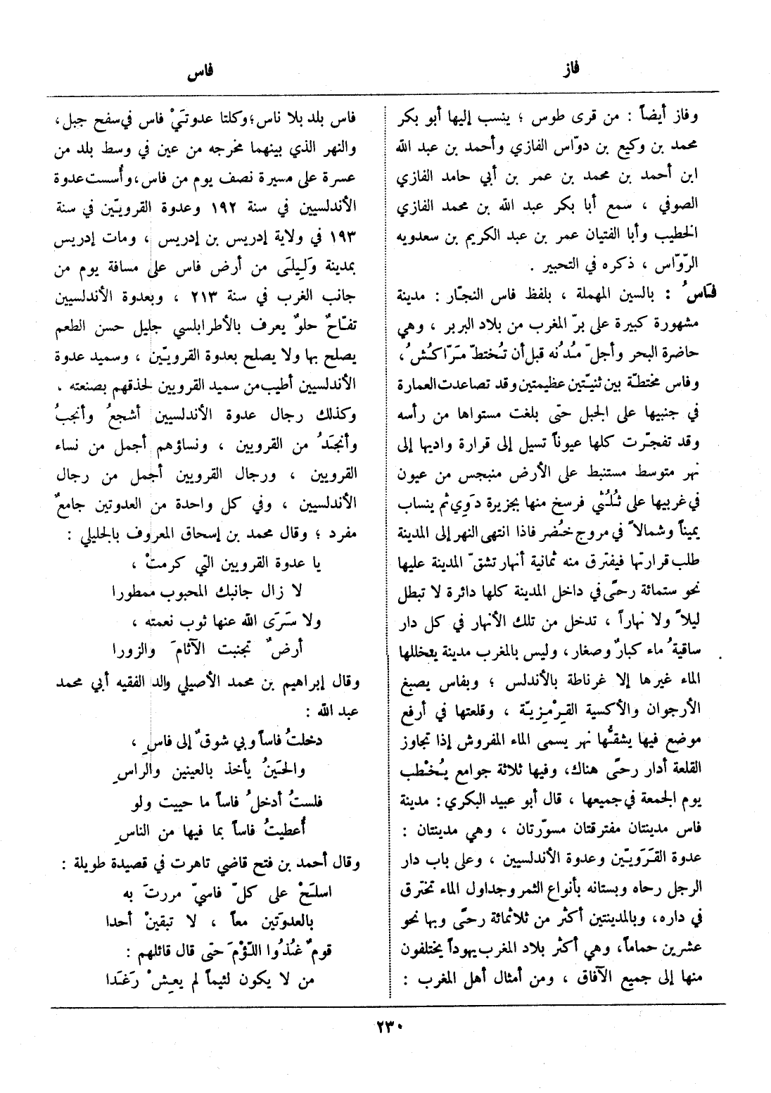 بالسين المهملة، بلفظ فاس النجّار: مدينة مشهورة كبيرة على برّ المغرب من بلاد البربر، وهي حاضرة البحر وأجلّ مدنه قبل أن تختطّ مرّاكش، وفاس مختطّة بين ثنيّتين عظيمتين وقد تصاعدت العمارة في جنبيها على الجبل حتى بلغت مستواها من رأسه وقد تفجّرت كلها عيونا تسيل إلى قرارة واديها إلى نهر متوسط مستنبط على الأرض منبجس من عيون في غربيها على ثلثي فرسخ منها بجزيرة دوي ثم ينساب يمينا وشمالا في مروج خضر فإذا انتهى النهر إلى المدينة طلب قرارتها فيفترق منه ثمانية أنهار تشقّ المدينة عليها نحو ستمائة رحى في داخل المدينة كلها دائرة لا تبطل ليلا ولا نهارا، تدخل من تلك الأنهار في كل دار ساقية ماء كبار وصغار، وليس بالمغرب مدينة يتخللها الماء غيرها إلا غرناطة بالأندلس، وبفاس يصبغ الأرجوان والأكسية القرمزيّة، وقلعتها في أرفع موضع فيها يشقّها نهر يسمى الماء المفروش إذا تجاوز القلعة أدار رحى هناك، وفيها ثلاثة جوامع يخطب يوم الجمعة في جميعها، قال أبو عبيد البكري: مدينة فاس مدينتان مفترقتان مسوّرتان، وهي مدينتان: