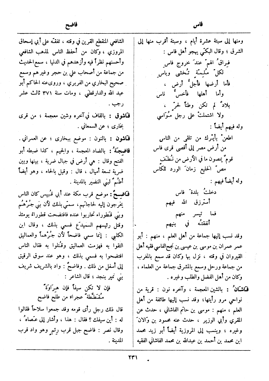 بالشين المعجمة، وآخره نون: قرية من نواحي مرو رأيتها، وقد نسب إليها طائفة من أهل العلم، منهم: موسى بن حاتم الفاشاني، حدث عن المقري وأبي الوزير، حدث عنه محمود بن والان وغيره، وينسب إلى المروزية أيضا أبو زيد محمد ابن محمد بن أحمد بن عبد الله بن محمد الفاشاني الفقيه الشافعي المنقطع القرين في وقته، تفقّه على أبي إسحاق المروزي، وكان من أحفظ الناس لمذهب الشافعي وأحسنهم نظرا فيه وأزهدهم في الدنيا، سمع الحديث من جماعة من أصحاب علي بن حجر وغيرهم وسمع صحيح البخاري من الفربري، وروى عنه الحاكم أبو عبد الله والدارقطني، ومات سنة 371 ثالث عشر رجب.