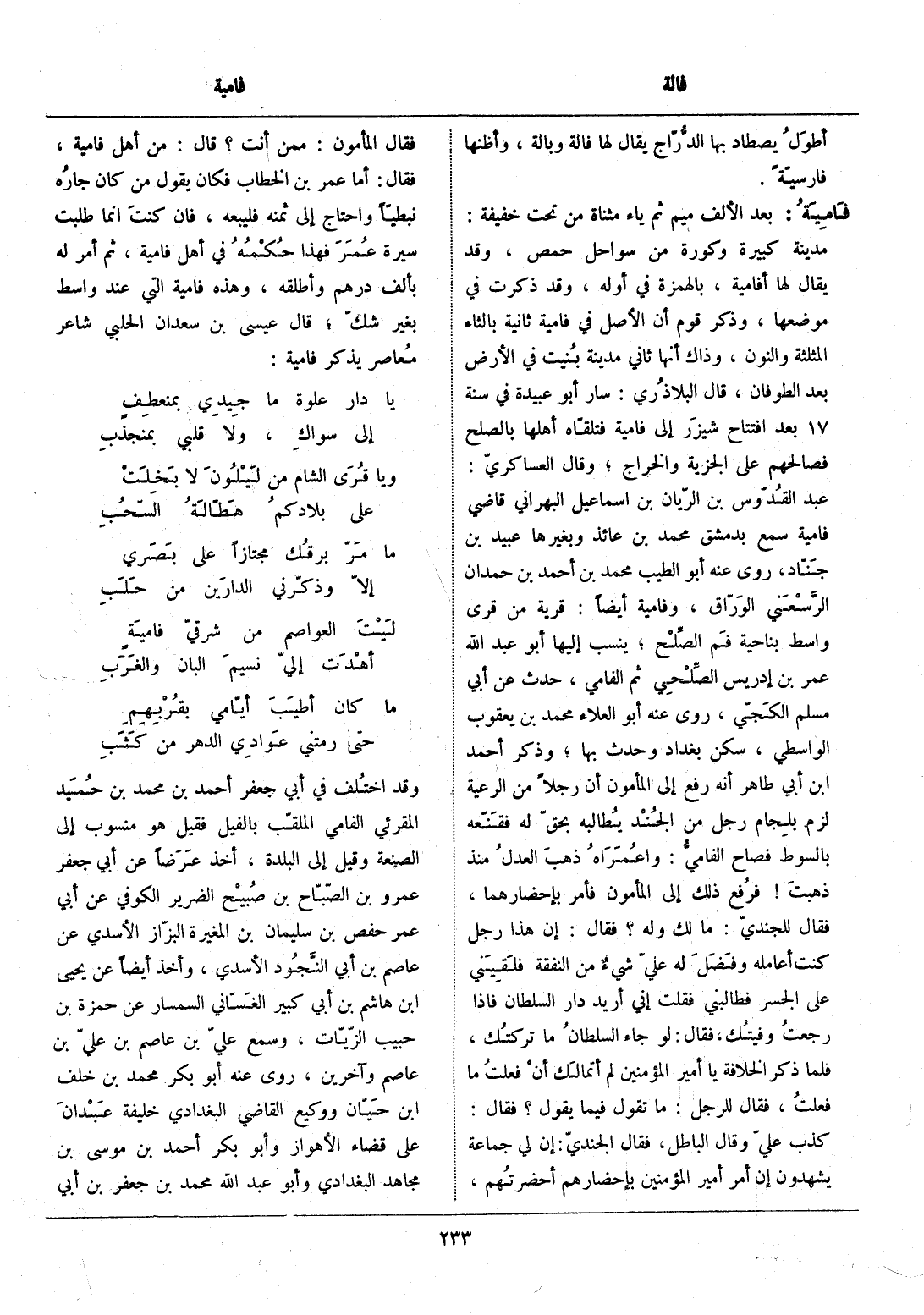 كذب عليّ وقال الباطل، فقال الجنديّ: إن لي جماعة يشهدون إن أمر أمير المؤمنين بإحضارهم أحضرتهم، فقال المأمون: ممن أنت؟ قال: من أهل فامية، فقال: أما عمر بن الخطاب فكان يقول من كان جاره نبطيّا واحتاج إلى ثمنه فليبعه، فان كنت انما طلبت سيرة عمر فهذا حكمه في أهل فامية، ثم أمر له بألف درهم وأطلقه، وهذه فامية التي عند واسط بغير شكّ، قال عيسى بن سعدان الحلبي شاعر معاصر يذكر فامية: