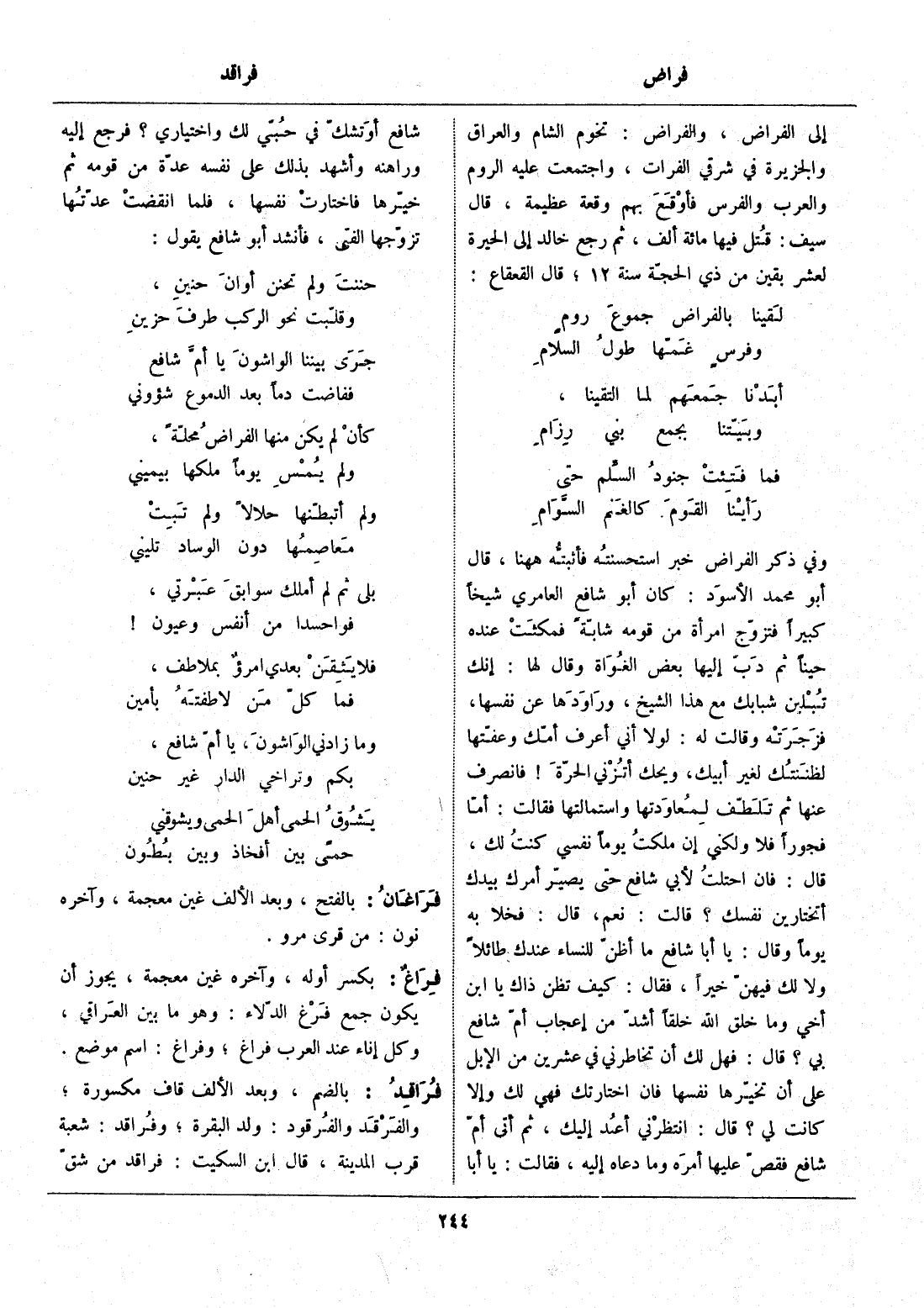 إلى الفراض، والفراض: تخوم الشام والعراق والجزيرة في شرقي الفرات، واجتمعت عليه الروم والعرب والفرس فأوقع بهم وقعة عظيمة، قال سيف: قتل فيها مائة ألف، ثم رجع خالد إلى الحيرة لعشر بقين من ذي الحجّة سنة 12، قال القعقاع: