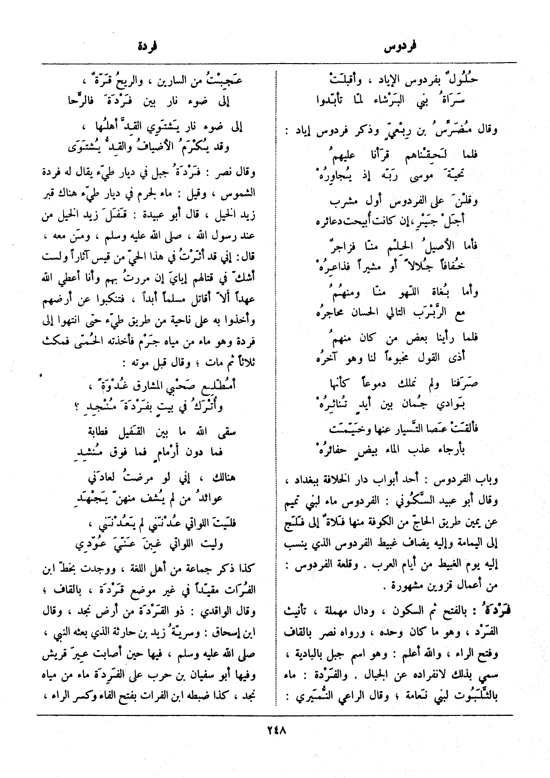 وباب الفردوس: أحد أبواب دار الخلافة ببغداد، وقال أبو عبيد السّكوني: الفردوس ماء لبني تميم عن يمين طريق الحاجّ من الكوفة منها فلاة إلى فلج إلى اليمامة وإليه يضاف غبيط الفردوس الذي ينسب إليه يوم الغبيط من أيام العرب. وقلعة الفردوس: