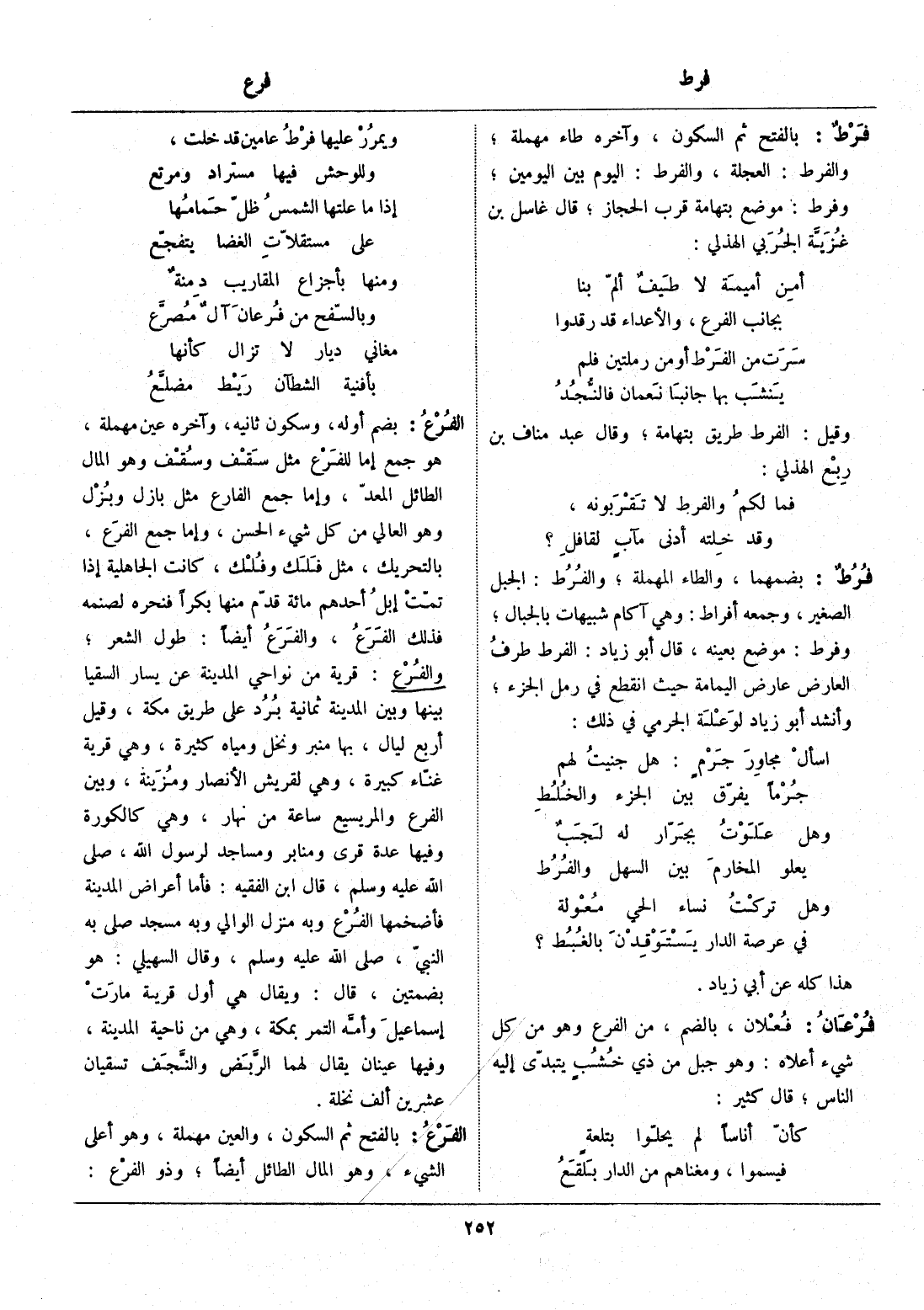 بضم أوله، وسكون ثانيه، وآخره عين مهملة، هو جمع إما للفرع مثل سقف وسقف وهو المال الطائل المعدّ، وإما جمع الفارع مثل بازل وبزل وهو العالي من كل شيء الحسن، وإما جمع الفرع، بالتحريك، مثل فلك وفلك، كانت الجاهلية إذا تمّت إبل أحدهم مائة قدّم منها بكرا فنحره لصنمه فذلك الفرع، والفرع أيضا: طول الشعر، والفرع: قرية من نواحي المدينة عن يسار السقيا بينها وبين المدينة ثمانية برد على طريق مكة، وقيل أربع ليال، بها منبر ونخل ومياه كثيرة، وهي قرية غنّاء كبيرة، وهي لقريش الأنصار ومزينة، وبين الفرع والمريسيع ساعة من نهار، وهي كالكورة وفيها عدة قرى ومنابر ومساجد لرسول الله، صلى الله عليه وسلم، قال ابن الفقيه: فأما أعراض المدينة فأضخمها الفرع وبه منزل الوالي وبه مسجد صلى به النبيّ، صلّى الله عليه وسلّم، وقال السهيلي: هو بضمتين، قال: ويقال هي أول قرية مارت إسماعيل وأمّه التمر بمكة، وهي من ناحية المدينة، وفيها عينان يقال لهما الرّبض والنّجف تسقيان عشرين ألف نخلة.