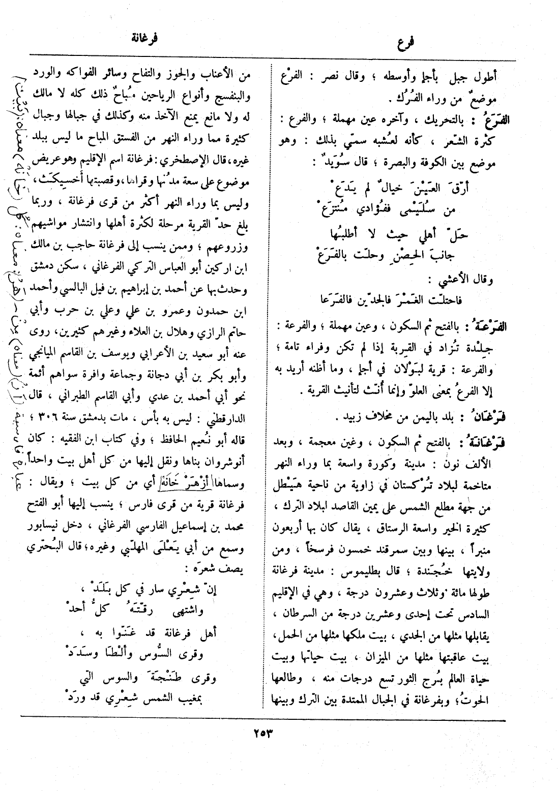 بالفتح ثم السكون، وغين معجمة، وبعد الألف نون: مدينة وكورة واسعة بما وراء النهر متاخمة لبلاد تركستان في زاوية من ناحية هيطل من جهة مطلع الشمس على يمين القاصد لبلاد الترك، كثيرة الخير واسعة الرستاق، يقال كان بها أربعون منبرا، بينها وبين سمرقند خمسون فرسخا، ومن ولايتها خجندة، قال بطليموس: مدينة فرغانة طولها مائة وثلاث وعشرون درجة، وهي في الإقليم السادس تحت إحدى وعشرين درجة من السرطان، يقابلها مثلها من الجدي، بيت ملكها مثلها من الحمل، بيت عاقبتها مثلها من الميزان، بيت حياتها وبيت حياة العالم برج الثور تسع درجات منه، وطالعها الحوت، وبفرغانة في الجبال الممتدة بين الترك وبينها من الأعناب والجوز والتفاح وسائر الفواكه والورد والبنفسج وأنواع الرياحين مباح ذلك كله لا مالك له ولا مانع يمنع الآخذ منه وكذلك في جبالها وجبال كثيرة مما وراء النهر من الفستق المباح ما ليس ببلد غيره، قال الإصطخري: فرغانة اسم الإقليم وهو عريض موضوع على سعة مدنها وقراها، وقصبتها أخسيكث، وليس بما وراء النهر أكثر من قرى فرغانة، وربما بلغ حدّ القرية مرحلة لكثرة أهلها وانتشار مواشيهم وزروعهم، وممن ينسب إلى فرغانة حاجب بن مالك ابن اركين أبو العباس التركي الفرغاني، سكن دمشق وحدث بها عن أحمد بن إبراهيم بن فيل البالسي وأحمد ابن حمدون وعمرو بن علي وعلي بن حرب وأبي حاتم الرازي وهلال بن العلاء وغيرهم كثيرين، روى عنه أبو سعيد بن الأعرابي ويوسف بن القاسم الميانجي وأبو بكر بن أبي دجانة وجماعة وافرة سواهم أئمة نحو أبي أحمد بن عدي وأبي القاسم الطبراني، قال الدارقطني: ليس به بأس، مات بدمشق سنة 306، قاله أبو نعيم الحافظ، وفي كتاب ابن الفقيه: كان أنوشروان بناها ونقل إليها من كل أهل بيت واحدا وسماها أزهر خانه أي من كل بيت، ويقال: