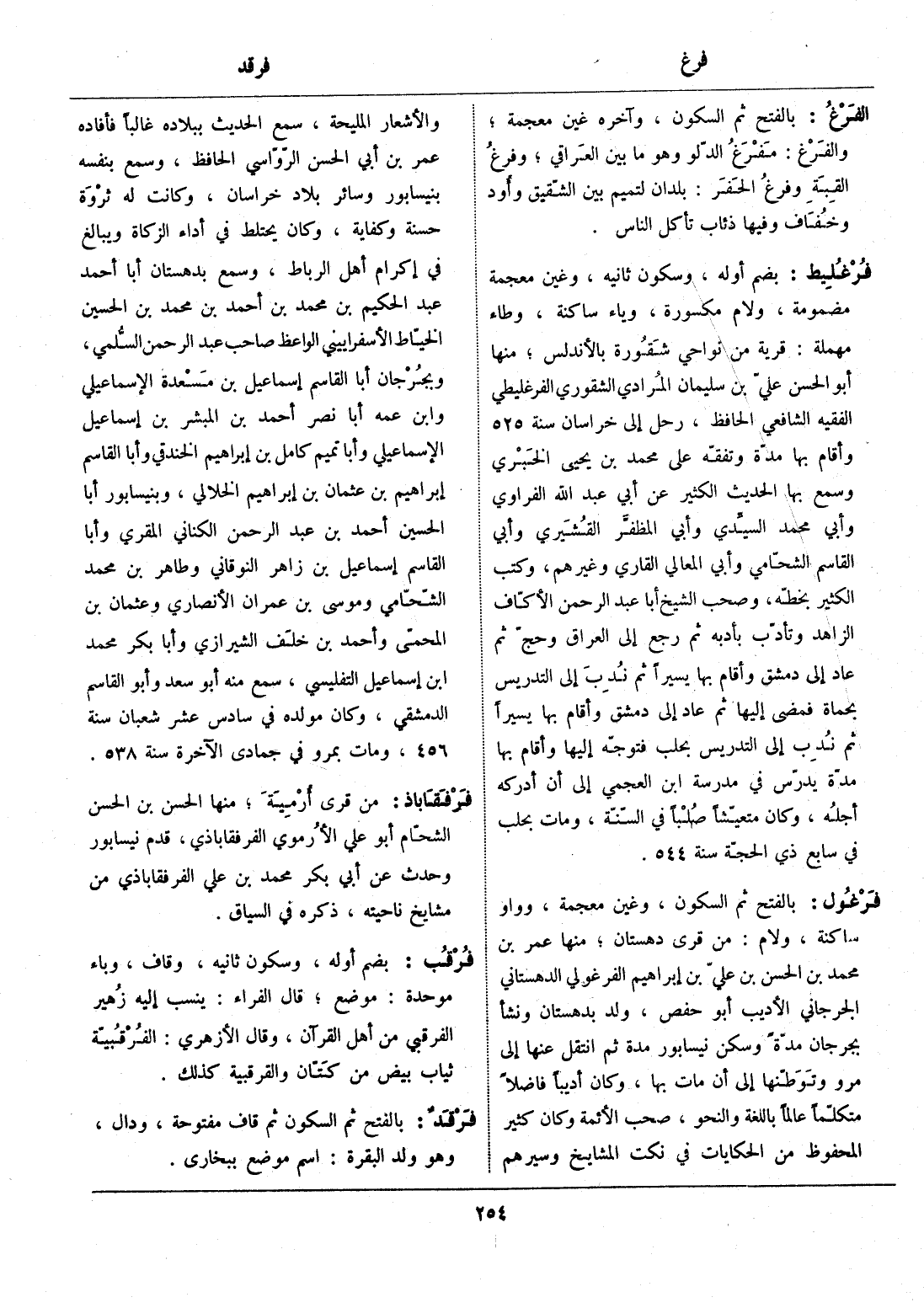 بالفتح ثم السكون، وغين معجمة، وواو ساكنة، ولام: من قرى دهستان، منها عمر بن محمد بن الحسن بن عليّ بن إبراهيم الفرغولي الدهستاني الجرجاني الأديب أبو حفص، ولد بدهستان ونشأ بجرجان مدّة وسكن نيسابور مدة ثم انتقل عنها إلى مرو وتوطّنها إلى أن مات بها، وكان أديبا فاضلا متكلّما عالما باللغة والنحو، صحب الأئمة وكان كثير المحفوظ من الحكايات في نكت المشايخ وسيرهم والأشعار المليحة، سمع الحديث ببلاده غالبا فأفاده عمر بن أبي الحسن الرّوّاسي الحافظ، وسمع بنفسه بنيسابور وسائر بلاد خراسان، وكانت له ثروة حسنة وكفاية، وكان يحتلط في أداء الزكاة ويبالغ في إكرام أهل الرباط، وسمع بدهستان أبا أحمد عبد الحكيم بن محمد بن أحمد بن محمد بن الحسين الخيّاط الأسفراييني الواعظ صاحب عبد الرحمن السّلمي، وبجرجان أبا القاسم إسماعيل بن مسعدة الإسماعيلي وابن عمه أبا نصر أحمد بن المبشر بن إسماعيل الإسماعيلي وأبا تميم كامل بن إبراهيم الخندقي وأبا القاسم إبراهيم بن عثمان بن إبراهيم الخلالي، وبنيسابور أبا الحسين أحمد بن عبد الرحمن الكناني المقري وأبا القاسم إسماعيل بن زاهر النوقاني وطاهر بن محمد الشّحّامي وموسى بن عمران الأنصاري وعثمان بن المحمّى وأحمد بن خلف الشيرازي وأبا بكر محمد ابن إسماعيل التفليسي، سمع منه أبو سعد وأبو القاسم الدمشقي، وكان مولده في سادس عشر شعبان سنة 456، ومات بمرو في جمادي الآخرة سنة 538.