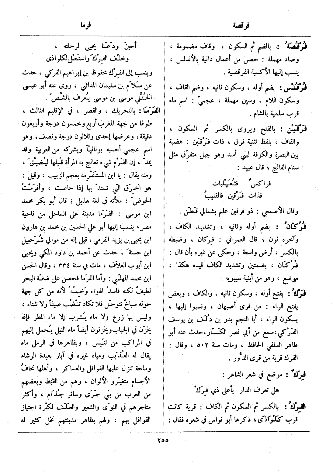 هو الخرق التي تستدّ بها إذا حاضت، وأفرمت الحوض: ملأته في لغة هذيل، قال أبو بكر محمد ابن موسى: الفرما مدينة على الساحل من ناحية مصر، ينسب إليها أبو علي الحسين بن محمد بن هارون ابن يحيى بن يزيد الفرمي، قيل إنه من موالي شرحبيل ابن حسنة، حدث عن أحمد بن داود المكي ويحيى ابن أيوب العلّاف، مات في سنة 334، وقال الحسن ابن محمد المهلّبي: وأما الفرما فحصن على ضفّة البحر لطيف لكنه فاسد الهواء وخمه لأنه من كل جهة حوله سباخ تتوحّل فلا تكاد تنضب صيفا ولا شتاء، وليس بها زرع ولا ماء يشرب إلا ماء المطر فإنه يخزن في الجباب ويخزنون أيضا ماء النيل يحمل إليهم في المراكب من تنّيس، وبظاهرها في الرمل ماء يقال له العذيب ومياه غيره في آبار بعيدة الرشاء وملحة تنزل عليها القوافل والعساكر، وأهلها نحاف الأجسام متغيّر والألوان، وهم من القبط وبعضهم من العرب من بني جرى وسائر جذام، وأكثر متاجرهم في النوى والشعير والعلف لكثرة اجتياز القوافل بهم، ولهم بظاهر مدينتهم نخل كثير له
