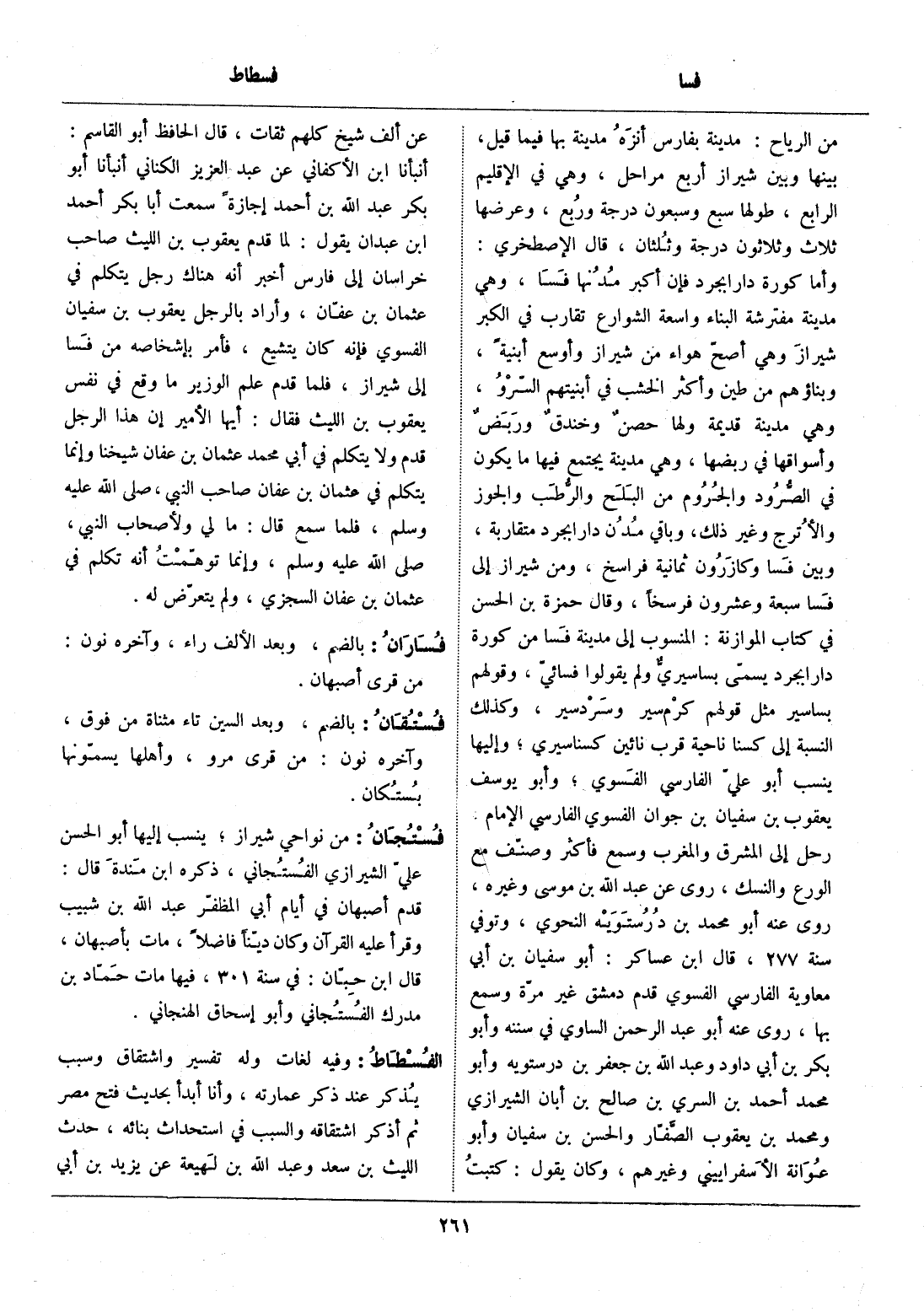 وأما كورة دارابجرد فإن أكبر مدنها فسا، وهي مدينة مفترشة البناء واسعة الشوارع تقارب في الكبر شيراز وهي أصحّ هواء من شيراز وأوسع أبنية، وبناؤهم من طين وأكثر الخشب في أبنيتهم السّرو، وهي مدينة قديمة ولها حصن وخندق وربض وأسواقها في ربضها، وهي مدينة يجتمع فيها ما يكون في الصّرود والجروم من البلح والرّطب والجوز والأترج وغير ذلك، وباقي مدن دارابجرد متقاربة، وبين فسا وكازرون ثمانية فراسخ، ومن شيراز إلى فسا سبعة وعشرون فرسخا، وقال حمزة بن الحسن في كتاب الموازنة: المنسوب إلى مدينة فسا من كورة دارابجرد يسمّى بساسيريّ ولم يقولوا فسائيّ، وقولهم بساسير مثل قولهم گرم سير وسردسير، وكذلك النسبة إلى كسنا ناحية قرب نائين كسناسيري، وإليها ينسب أبو عليّ الفارسي الفسوي، وأبو يوسف يعقوب بن سفيان بن جوان الفسوي الفارسي الإمام، رحل إلى المشرق والمغرب وسمع فأكثر وصنّف مع الورع والنسك، روى عن عبد الله بن موسى وغيره، روى عنه أبو محمد بن درستويه النحوي، وتوفي سنة 277، قال ابن عساكر: أبو سفيان بن أبي معاوية الفارسي الفسوي قدم دمشق غير مرّة وسمع بها، روى عنه أبو عبد الرحمن الساوي في سننه وأبو بكر بن أبي داود وعبد الله بن جعفر بن درستويه وأبو محمد أحمد بن السري بن صالح بن أبان الشيرازي ومحمد بن يعقوب الصّفّار والحسن بن سفيان وأبو عوانة الأسفراييني وغيرهم، وكان يقول: كتبت عن ألف شيخ كلهم ثقات، قال الحافظ أبو القاسم: