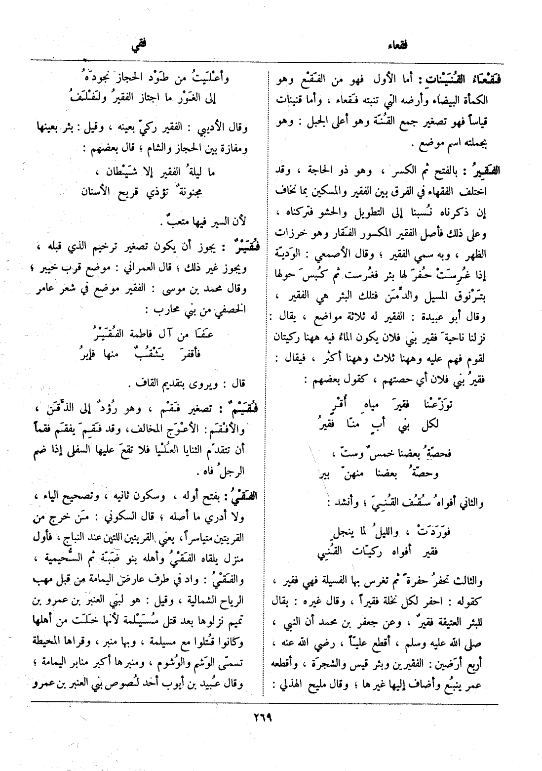 بالفتح ثم الكسر، وهو ذو الحاجة، وقد اختلف الفقهاء في الفرق بين الفقير والمسكين بما نخاف إن ذكرناه نسبنا إلى التطويل والحشو فتركناه، وعلى ذلك فأصل الفقير المكسور الفقار وهو خرزات الظهر، وبه سمي الفقير، وقال الأصمعي: الوديّة إذا غرست حفر لها بئر فغرست ثم كبس حولها بترنوق المسيل والدّمن فتلك البئر هي الفقير، وقال أبو عبيدة: الفقير له ثلاثة مواضع، يقال: