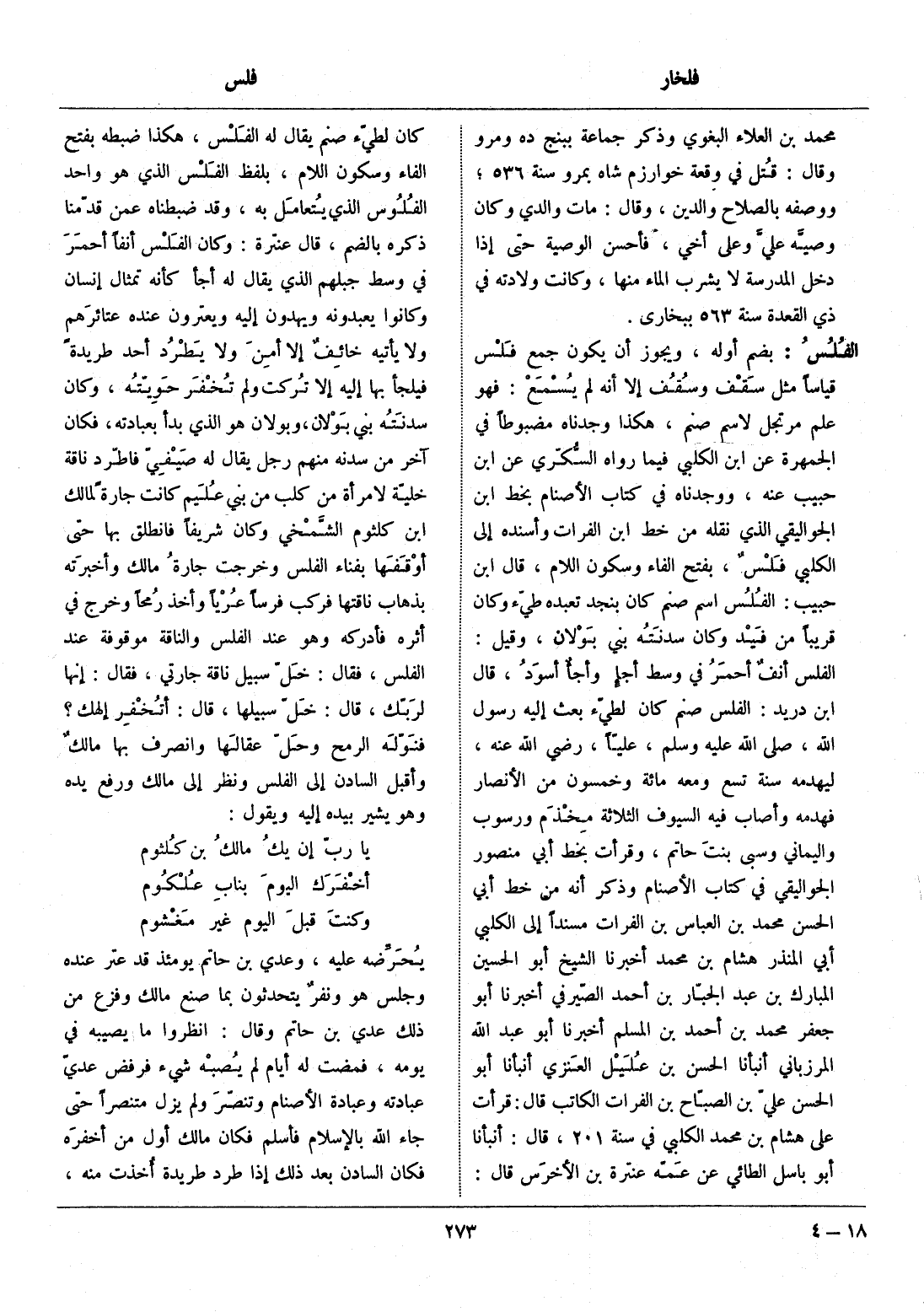 كان لطيّء صنم يقال له الفلس، هكذا ضبطه بفتح الفاء وسكون اللام، بلفظ الفلس الذي هو واحد الفلوس الذي يتعامل به، وقد ضبطناه عمن قدّمنا ذكره بالضم، قال عنترة: وكان الفلس أنفا أحمر في وسط جبلهم الذي يقال له أجأ كأنه تمثال إنسان وكانوا يعبدونه ويهدون إليه ويعترون عنده عتائرهم ولا يأتيه خائف إلا أمن ولا يطرد أحد طريدة فيلجأ بها إليه إلا تركت ولم تخفر حويّته، وكان سدنته بني بولان، وبولان هو الذي بدأ بعبادته، فكان آخر من سدنه منهم رجل يقال له صيفيّ فاطّرد ناقة خليّة لامرأة من كلب من بني عليم كانت جارة لمالك ابن كلثوم الشّمخي وكان شريفا فانطلق بها حتى أوقفها بفناء الفلس وخرجت جارة مالك وأخبرته بذهاب ناقتها فركب فرسا عريا وأخذ رمحا وخرج في أثره فأدركه وهو عند الفلس والناقة موقوفة عند الفلس، فقال: خلّ سبيل ناقة جارتي، فقال: إنها لربّك، قال: خلّ سبيلها، قال: أتخفر إلهك؟