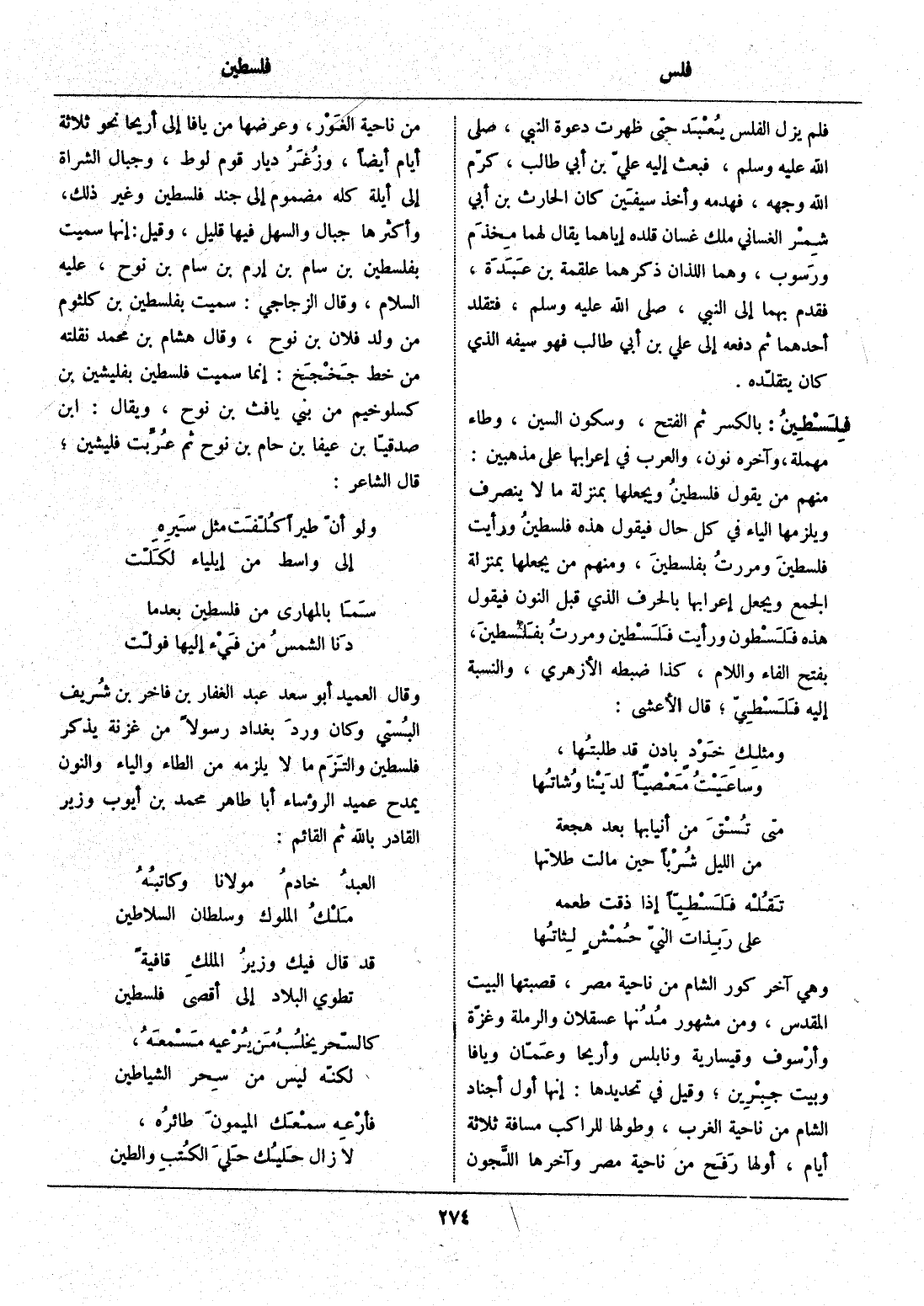 وقال العميد أبو سعد عبد الغفار بن فاخر بن شريف البستي وكان ورد بغداد رسولا من غزنة يذكر فلسطين والتزم ما لا يلزمه من الطاء والياء والنون يمدح عميد الرؤساء أبا طاهر محمد بن أيوب وزير القادر بالله ثم القائم: