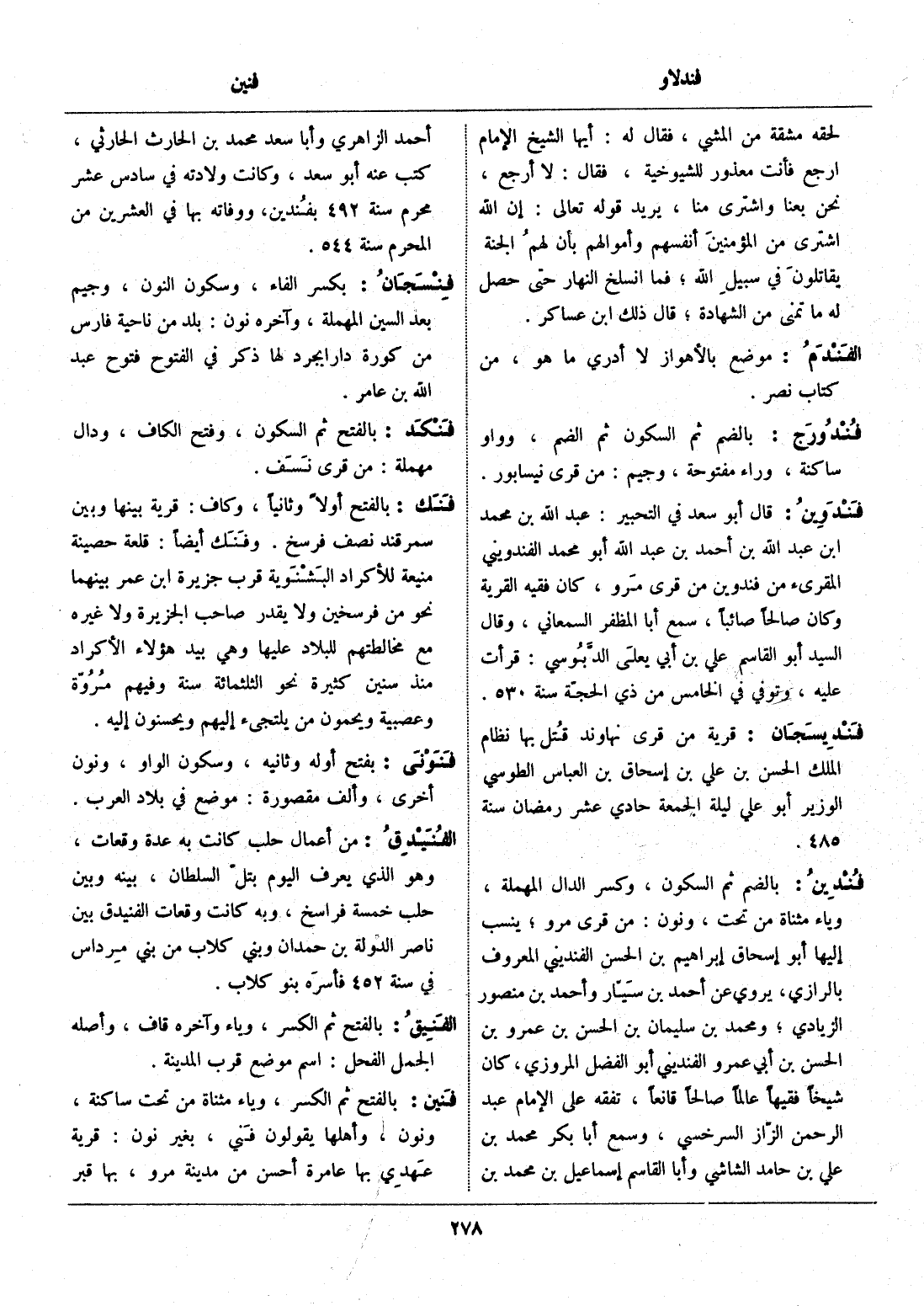 بالضم ثم السكون، وكسر الدال المهملة، وياء مثناة من تحت، ونون: من قرى مرو، ينسب إليها أبو إسحاق إبراهيم بن الحسن الفنديني المعروف بالرازي، يروي عن أحمد بن سيّار وأحمد بن منصور الزيادي، ومحمد بن سليمان بن الحسن بن عمرو بن الحسن بن أبي عمرو الفنديني أبو الفضل المروزي، كان شيخا فقيها عالما صالحا قانعا، تفقه على الإمام عبد الرحمن الزّاز السرخسي، وسمع أبا بكر محمد بن علي بن حامد الشاشي وأبا القاسم إسماعيل بن محمد بن أحمد الزاهري وأبا سعد محمد بن الحارث الحارثي، كتب عنه أبو سعد، وكانت ولادته في سادس عشر محرم سنة 492 بفندين، ووفاته بها في العشرين من المحرم سنة 544.