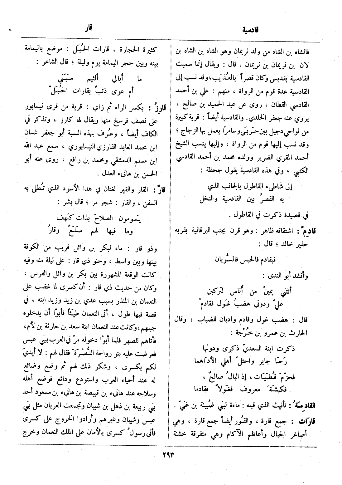 فالشاه بن الشاه من ولد نريمان وهو الشاه بن الشاه بن لان بن نريمان بن نريمان، قال: ويقال إنما سميت القادسية بقديس وكان قصرا بالعذيب، وقد نسب إلى القادسية عدة قوم من الرواة، منهم: علي بن أحمد القادسي القطان، روى عن عبد الحميد بن صالح، يروي عنه جعفر الخلدي. والقادسية أيضا: قرية كبيرة من نواحي دجيل بين حربى وسامرّا يعمل بها الزجاج، وقد نسب إليها قوم من الرواة، وإليها ينسب الشيخ أحمد المقري الضرير وولده محمد بن أحمد القادسي الكتبي، وفي هذه القادسية يقول جحظة: