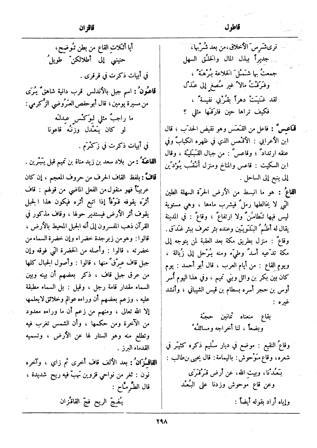 بلفظ القاف الحرف من حروف المعجم، إن كان عربيّا فهو منقول من الفعل الماضي من قولهم: قاف أثره يقوفه قوفا إذا اتبع أثره فيكون هذا الجبل يقوف أثر الأرض فيستدير حولها، وقاف مذكور في القرآن ذهب المفسرون إلى أنه الجبل المحيط بالأرض، قالوا: وهو من زبرجدة خضراء وإن خضرة السماء من خضرته، قالوا: وأصله من الخضرة التي فوقه وإن جبل قاف عرق منها، قالوا: وأصول الجبال كلها من عرق جبل قاف، ذكر بعضهم أن بينه وبين السماء مقدار قامة رجل، وقيل: بل السماء مطبقة عليه، وزعم بعضهم أن وراءه عوالم وخلائق لا يعلمها إلا الله تعالى، ومنهم من زعم أن ما وراءه معدود من الآخرة ومن حكمها، وأن الشمس تغرب فيه وتطلع منه وهو الستار لها عن الأرض، وتسميه القدماء البرز.