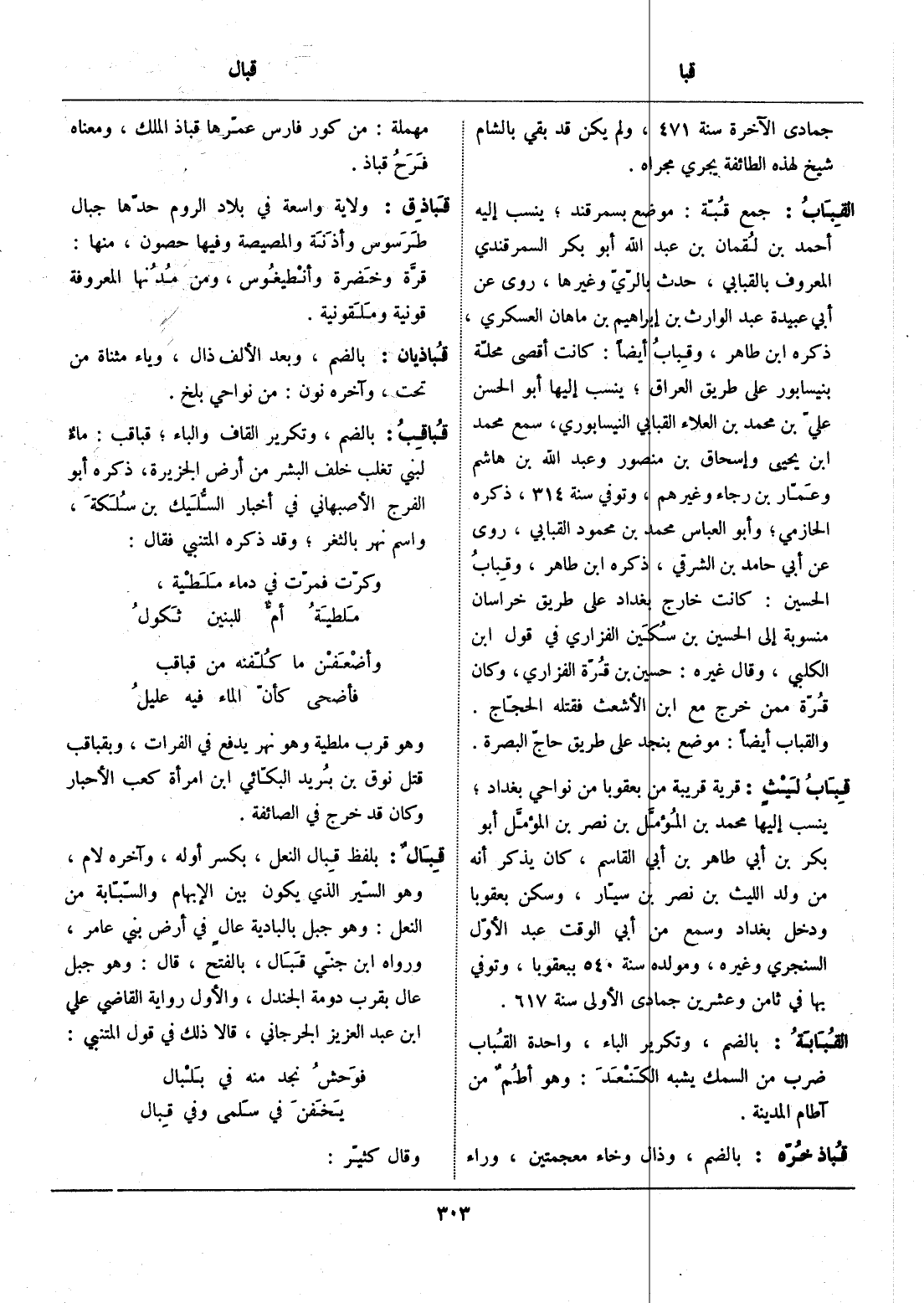 بالضم، وتكرير القاف والباء، قباقب: ماء لبني تغلب خلف البشر من أرض الجزيرة، ذكره أبو الفرج الأصبهاني في أخبار السّليك بن سلكة، واسم نهر بالثغر، وقد ذكره المتنبي فقال: