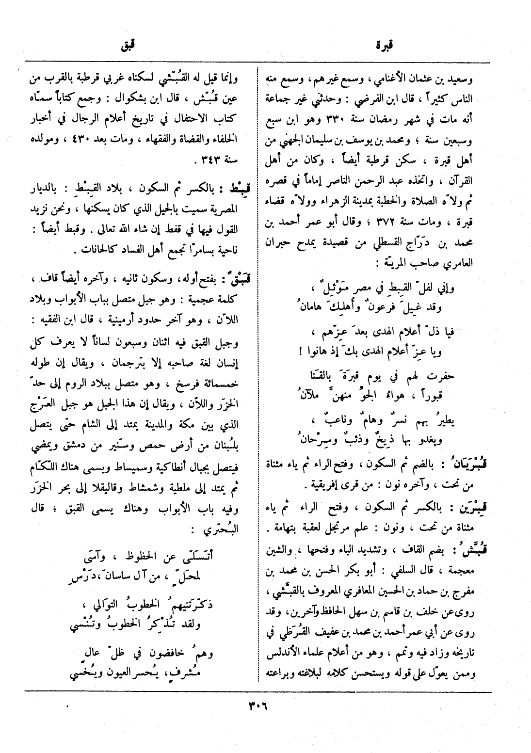 بضم القاف، وتشديد الباء وفتحها، والشين معجمة، قال السلفي: أبو بكر الحسن بن محمد بن مفرج بن حماد بن الحسين المعافري المعروف بالقبّشي، روى عن خلف بن قاسم بن سهل الحافظ وآخرين، وقد روى عن أبي عمر أحمد بن محمد بن عفيف القرظي في تاريخه وزاد فيه وتمم، وهو من أعلام علماء الأندلس وممن يعوّل على قوله ويستحسن كلامه لبلاغته وبراعته وإنما قيل له القبّشي لسكناه غربي قرطبة بالقرب من عين قبّش، قال ابن بشكوال: وجمع كتابا سمّاه كتاب الاحتفال في تاريخ أعلام الرجال في أخبار الخلفاء والقضاة والفقهاء، ومات بعد 430، ومولده سنة 343.
