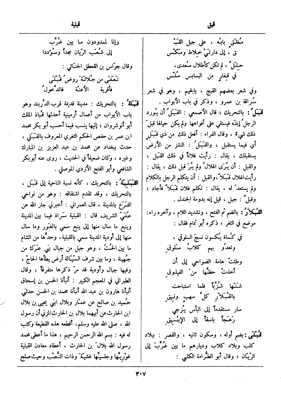 بالتحريك، كأنه نسبة الناحية إلى قبل، بالتحريك، وقد تقدم اشتقاقه: وهو من نواحي الفرع بالمدينة، قال العمراني: أخبرني جار الله عن عليّ الشريف قال: القبلية سراة فيما بين المدينة وينبع ما سال منها إلى ينبع سمي بالغور وما سال منها إلى أودية المدينة سمي بالقبلية، وحدّها من الشام ما بين الحتّ، وهو جبل من جبال بني عرك من جهينة، وما بين شرف السّيّالة أرض يطأها الحاجّ، وفيها جبال وأودية قد مرّ ذكرها متفرقا، وقال الطبراني في المعجم الكبير: أنبأنا الحسن بن إسحاق أنبأنا هارون بن عبد الله أنبأنا محمد بن الحسن حدثني حميد بن صالح عن عمّار وبلال ابني يحيى بن بلال ابن الحارث عن أبيهما بلال بن الحارث المزني أن رسول الله، صلّى الله عليه وسلّم، أقطعه هذه القطيعة وكتب له فيه: بسم الله الرحمن الرحيم، هذا ما أعطى محمد رسول الله بلال بن الحارث، أعطاه معادن القبلية غوريّها وجلسيّها غشيّة وذات النّصب وحيث صلح