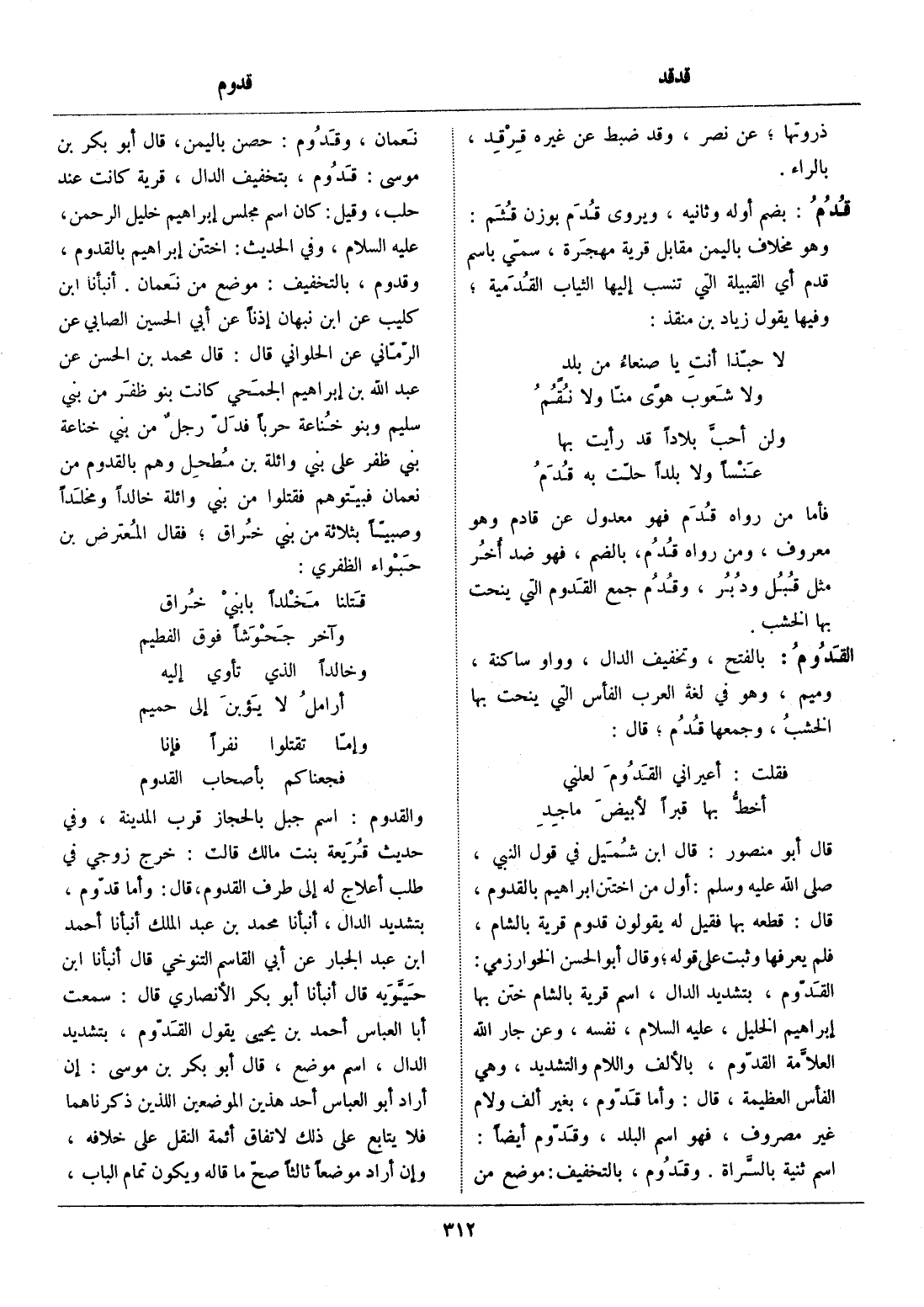 اسم ثنية بالسّراة. وقدوم، بالتخفيف: موضع من نعمان، وقدوم: حصن باليمن، قال أبو بكر بن موسى: قدوم، بتخفيف الدال، قرية كانت عند حلب، وقيل: كان اسم مجلس إبراهيم خليل الرحمن، عليه السّلام، وفي الحديث: اختتن إبراهيم بالقدوم، وقدوم، بالتخفيف: موضع من نعمان. أنبأنا ابن كليب عن ابن نبهان إذنا عن أبي الحسين الصابي عن الرّمّاني عن الحلواني قال: قال محمد بن الحسن عن عبد الله بن إبراهيم الجمحي كانت بنو ظفر من بني سليم وبنو خناعة حربا فدلّ رجل من بني خناعة بني ظفر على بني وائلة بن مطحل وهم بالقدوم من نعمان فبيّتوهم فقتلوا من بني وائلة خالدا ومخلدا وصبيّا بثلاثة من بني خراق، فقال المعترض بن حبواء الظفري: