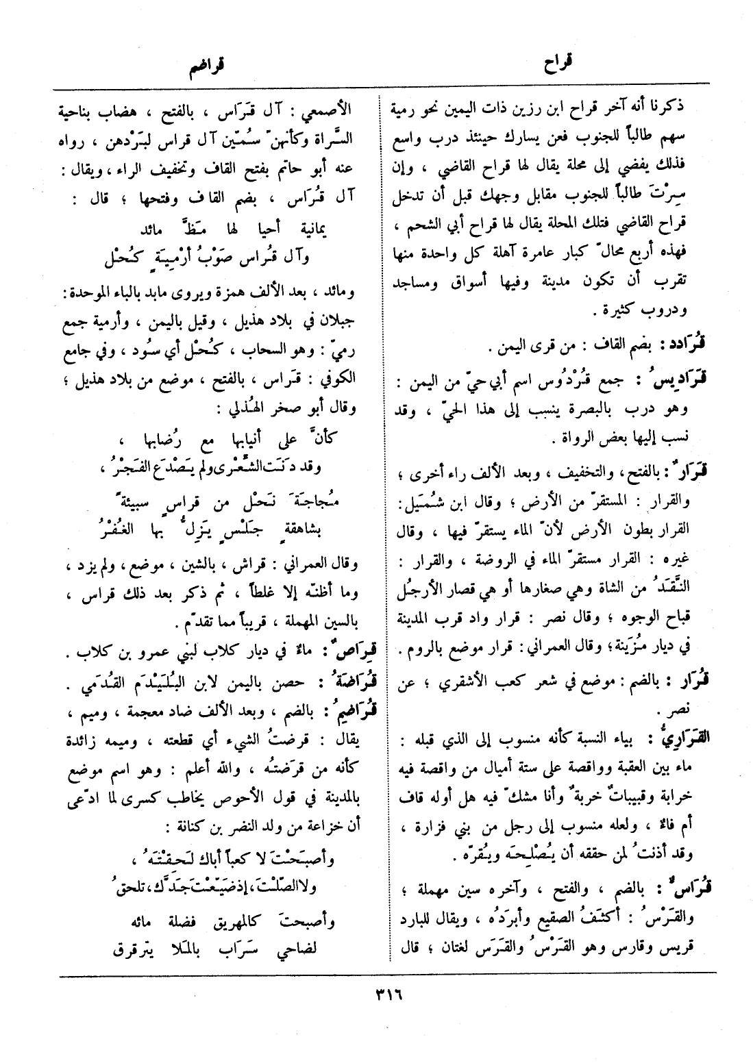 وقال العمراني: قراش، بالشين، موضع، ولم يزد، وما أظنّه إلا غلطا، ثم ذكر بعد ذلك قراس، بالسين المهملة، قريبا مما تقدّم.