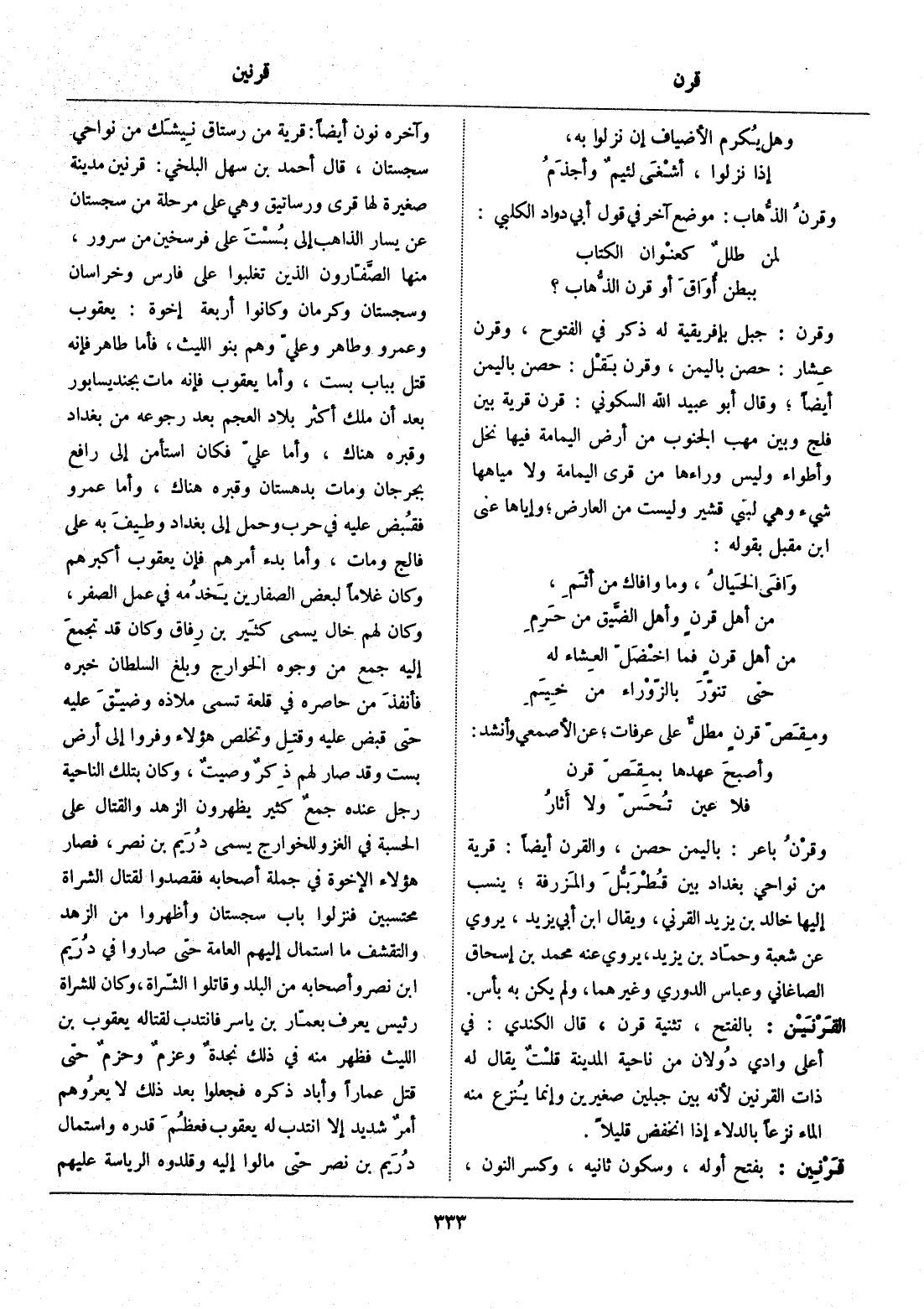 بفتح أوله، وسكون ثانيه، وكسر النون، وآخره نون أيضا: قرية من رستاق نيشك من نواحي سجستان، قال أحمد بن سهل البلخي: قرنين مدينة صغيرة لها قرى ورساتيق وهي على مرحلة من سجستان عن يسار الذاهب إلى بست على فرسخين من سرور، منها الصّفّارون الذين تغلبوا على فارس وخراسان وسجستان وكرمان وكانوا أربعة إخوة: يعقوب وعمرو وطاهر وعليّ وهم بنو الليث، فأما طاهر فإنه قتل بباب بست، وأما يعقوب فإنه مات بجنديسابور بعد أن ملك أكثر بلاد العجم بعد رجوعه من بغداد وقبره هناك، وأما عليّ فكان استأمن إلى رافع بجرجان ومات بدهستان وقبره هناك، وأما عمرو فقبض عليه في حرب وحمل إلى بغداد وطيف به على فالج ومات، وأما بدء أمرهم فإن يعقوب أكبرهم وكان غلاما لبعض الصفارين يخدمه في عمل الصفر، وكان لهم خال يسمى كثير بن رفاق وكان قد تجمع إليه جمع من وجوه الخوارج وبلغ السلطان خبره فأنفذ من حاصره في قلعة تسمى ملاذه وضيّق عليه حتى قبض عليه وقتل وتخلص هؤلاء وفروا إلى أرض بست وقد صار لهم ذكر وصيت، وكان بتلك الناحية رجل عنده جمع كثير يظهرون الزهد والقتال على الحسبة في الغزو للخوارج يسمى دريم بن نصر، فصار هؤلاء الإخوة في جملة أصحابه فقصدوا لقتال الشراة محتسبين فنزلوا باب سجستان وأظهروا من الزهد والتقشف ما استمال إليهم العامة حتى صاروا في دريم ابن نصر وأصحابه من البلد وقاتلوا الشّراة، وكان للشراة رئيس يعرف بعمّار بن ياسر فانتدب لقتاله يعقوب بن الليث فظهر منه في ذلك نجدة وعزم وحزم حتى قتل عمارا وأباد ذكره فجعلوا بعد ذلك لا يعروهم أمر شديد إلا انتدب له يعقوب فعظم قدره واستمال دريم بن نصر حتى مالوا إليه وقلدوه الرياسة عليهم