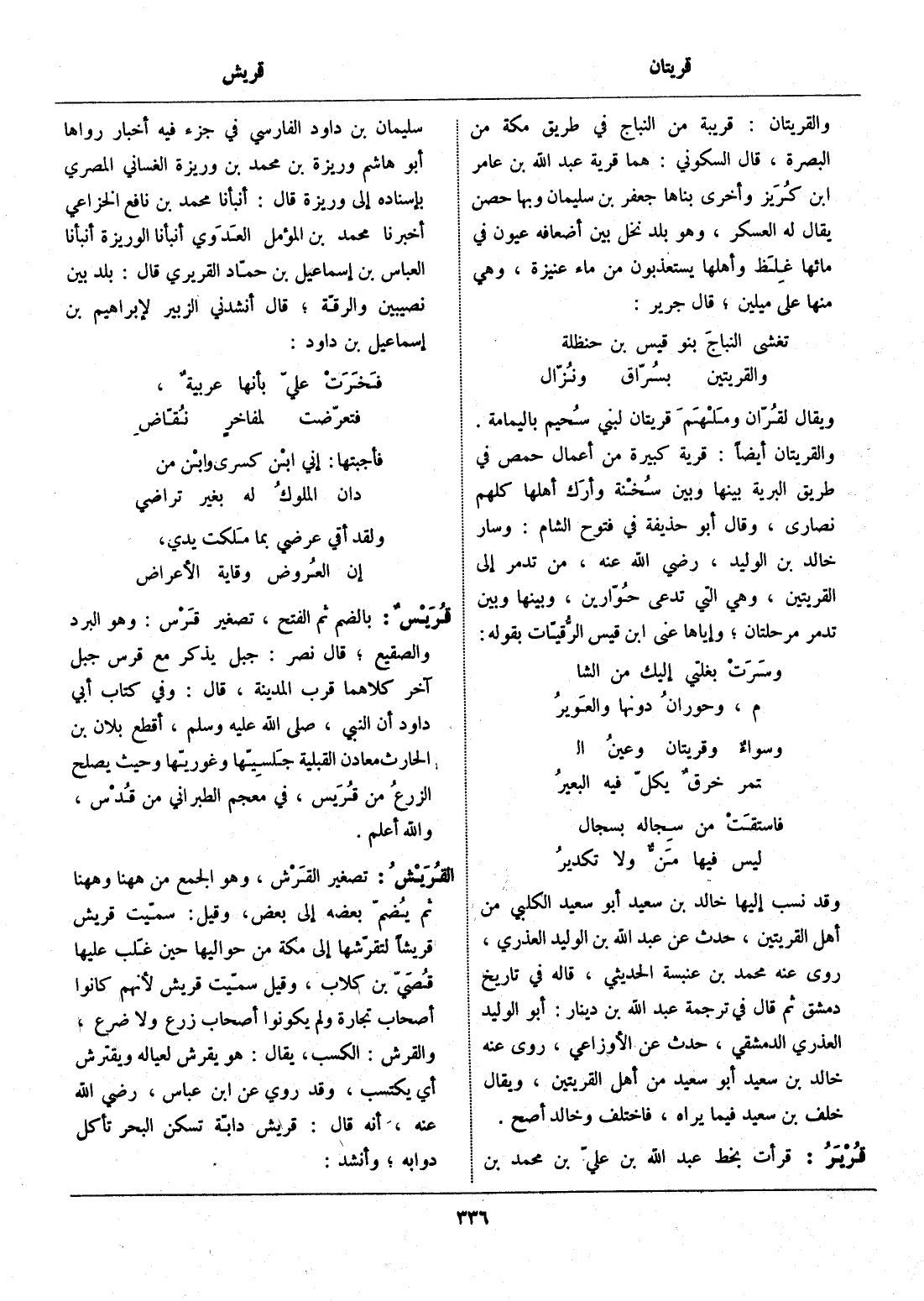 والقريتان أيضا: قرية كبيرة من أعمال حمص في طريق البرية بينها وبين سخنة وأرك أهلها كلهم نصارى، وقال أبو حذيفة في فتوح الشام: وسار خالد بن الوليد، رضي الله عنه، من تدمر إلى القريتين، وهي التي تدعى حوّارين، وبينها وبين تدمر مرحلتان، وإياها عنى ابن قيس الرّقيّات بقوله: