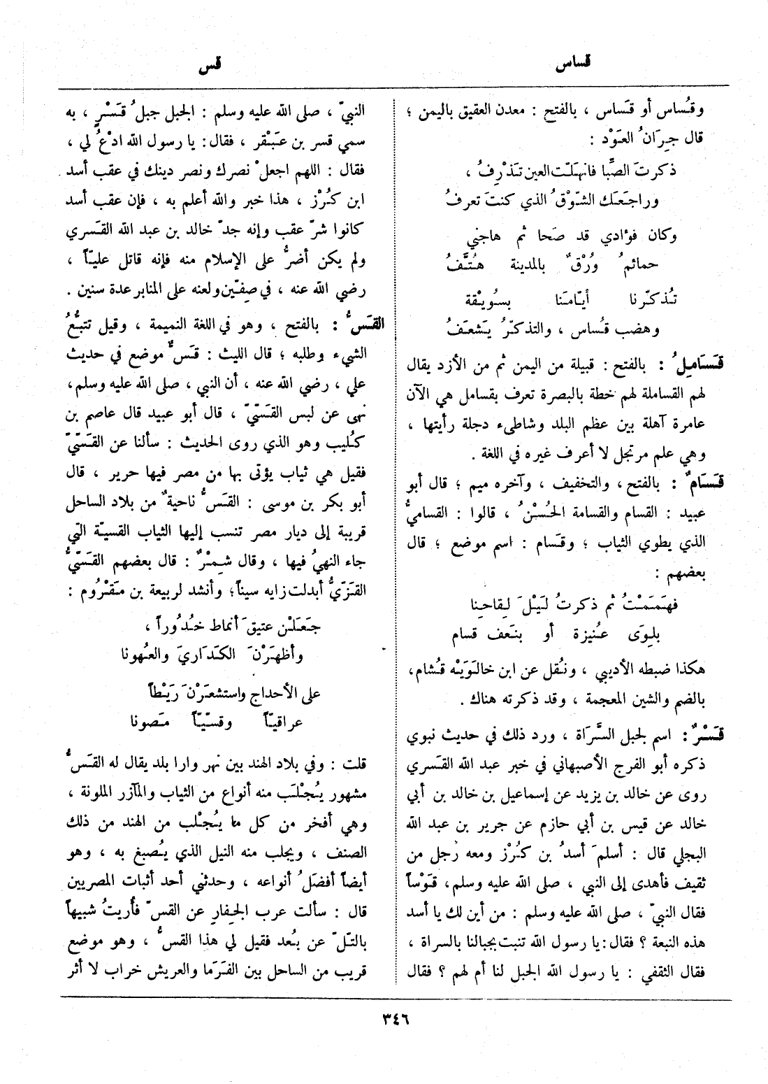 بالفتح، وهو في اللغة النميمة، وقيل تتبّع الشيء وطلبه، قال الليث: قسّ موضع في حديث عليّ، رضي الله عنه، أن النبي، صلّى الله عليه وسلّم، نهى عن لبس القسّيّ، قال أبو عبيد قال عاصم بن كليب وهو الذي روى الحديث: سألنا عن القسّيّ فقيل هي ثياب يؤتى بها من مصر فيها حرير، قال أبو بكر بن موسى: القسّ ناحية من بلاد الساحل قريبة إلى ديار مصر تنسب إليها الثياب القسيّة التي جاء النهي فيها، وقال شمر: قال بعضهم القسّيّ القزّيّ أبدلت زايه سينا، وأنشد لربيعة بن مقروم: