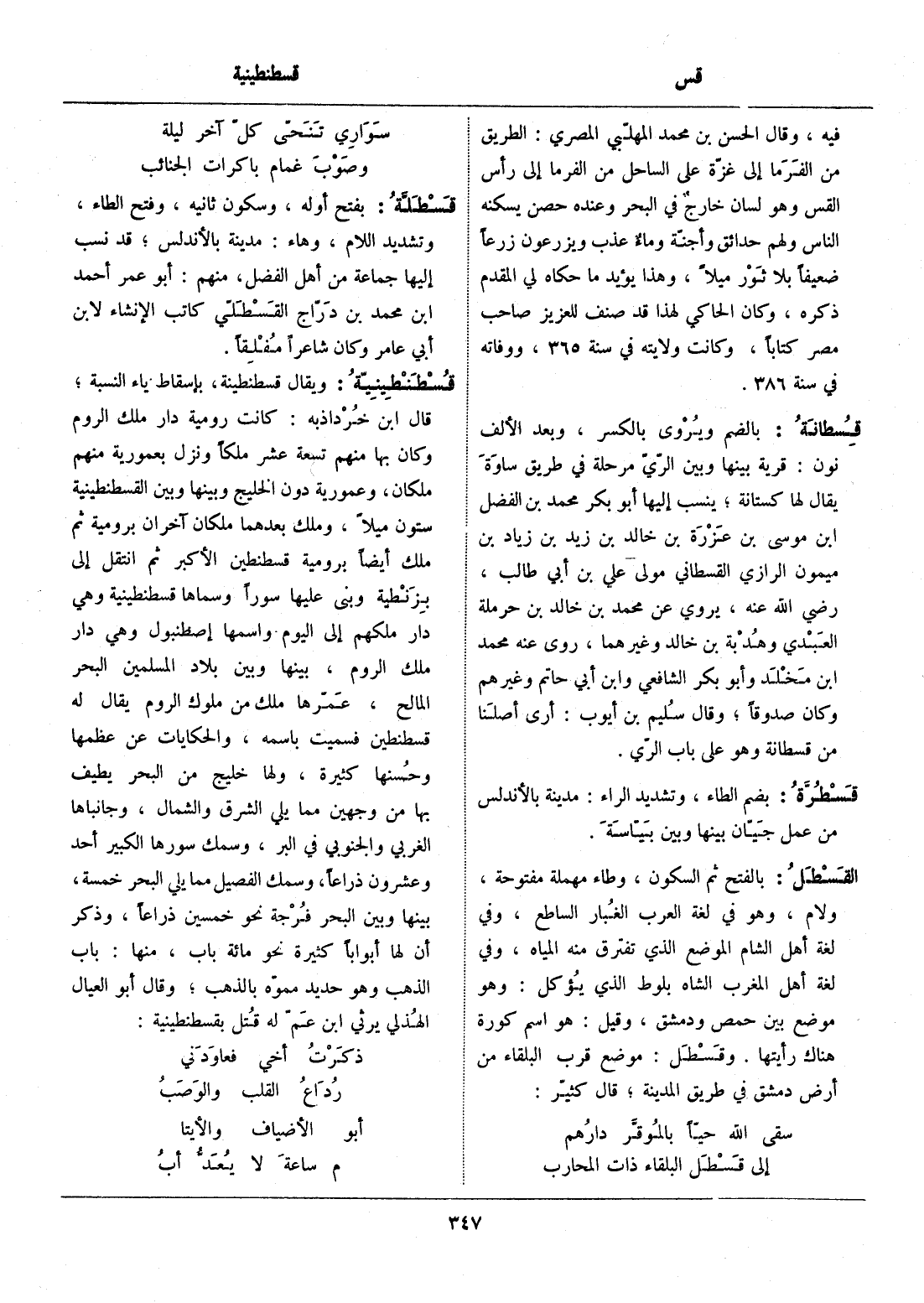 ويقال قسطنطينة، بإسقاط ياء النسبة، قال ابن خرداذبه: كانت رومية دار ملك الروم وكان بها منهم تسعة عشر ملكا ونزل بعمورية منهم ملكان، وعمورية دون الخليج وبينها وبين القسطنطينية ستون ميلا، وملك بعدهما ملكان آخران برومية ثم ملك أيضا برومية قسطنطين الأكبر ثم انتقل إلى بزنطية وبنى عليها سورا وسماها قسطنطينية وهي دار ملكهم إلى اليوم واسمها اصطنبول وهي دار ملك الروم، بينها وبين بلاد المسلمين البحر المالح، عمّرها ملك من ملوك الروم يقال له قسطنطين فسميت باسمه، والحكايات عن عظمها وحسنها كثيرة، ولها خليج من البحر يطيف بها من وجهين مما يلي الشرق والشمال، وجانباها الغربي والجنوبي في البر، وسمك سورها الكبير أحد وعشرون ذراعا، وسمك الفصيل مما يلي البحر خمسة، بينها وبين البحر فرجة نحو خمسين ذراعا، وذكر أن لها أبوابا كثيرة نحو مائة باب، منها: باب الذهب وهو حديد مموّه بالذهب، وقال أبو العيال الهذلي يرثي ابن عمّ له قتل بقسطنطينية: