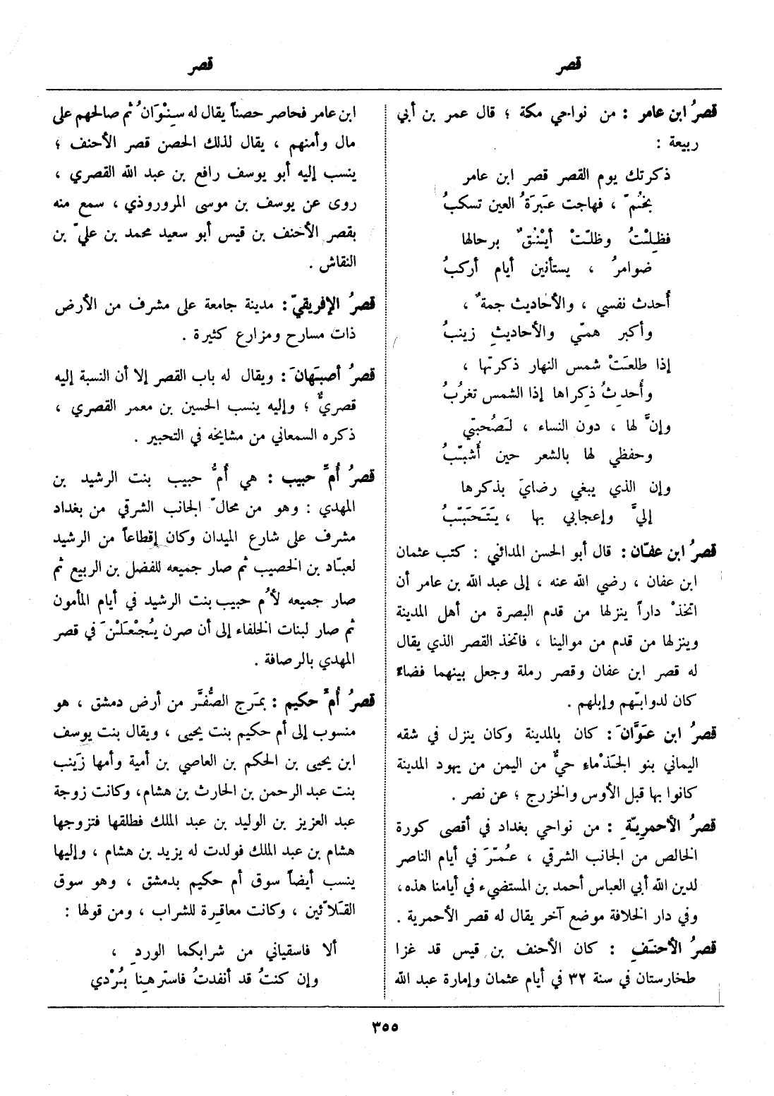 قال أبو الحسن المدائني: كتب عثمان ابن عفان، رضي الله عنه، إلى عبد الله بن عامر أن اتخذ دارا ينزلها من قدم البصرة من أهل المدينة وينزلها من قدم من موالينا، فاتخذ القصر الذي يقال له قصر ابن عفان وقصر رملة وجعل بينهما فضاء كان لدوابّهم وإبلهم.