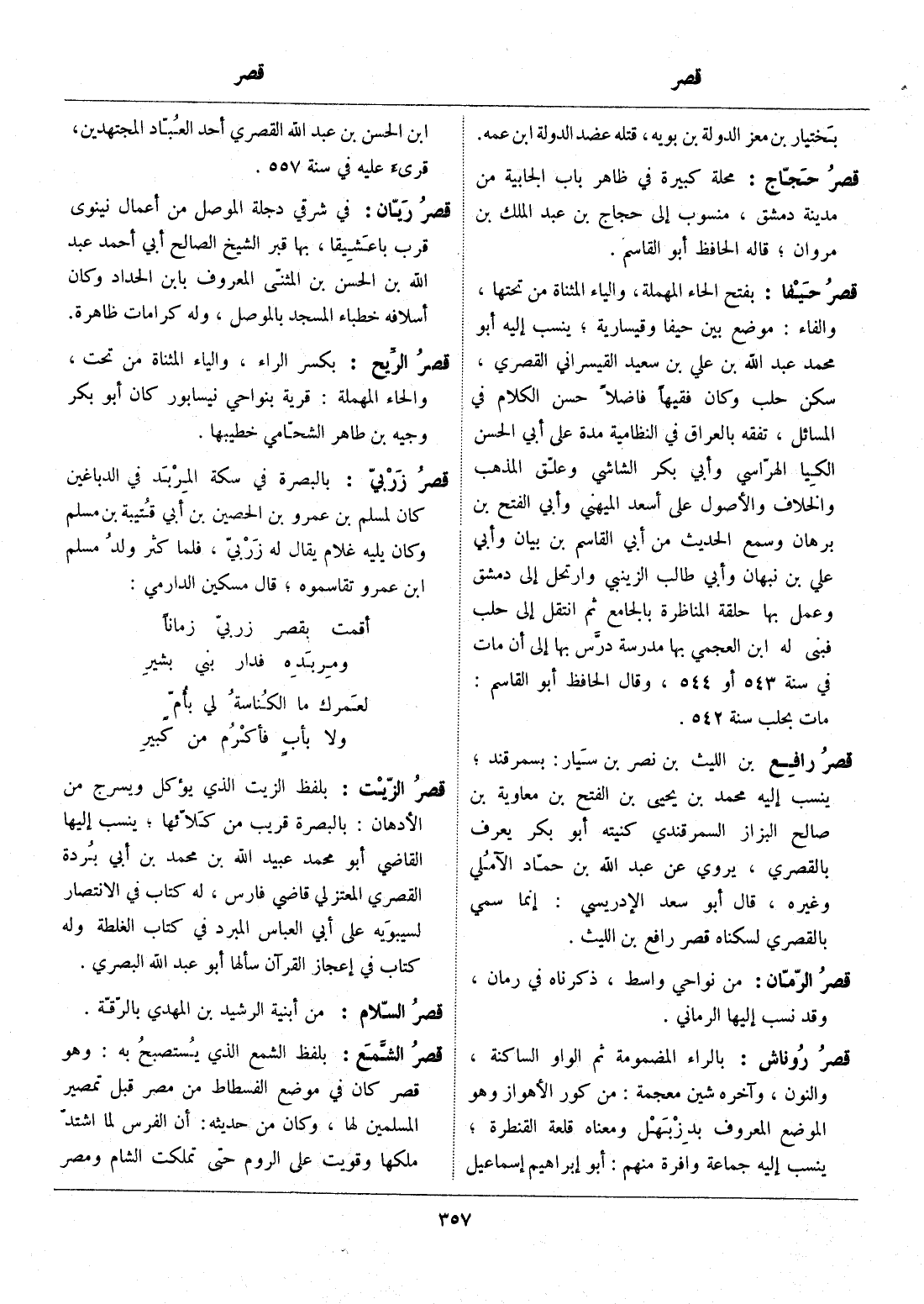 بلفظ الزيت الذي يؤكل ويسرج من الأدهان: بالبصرة قريب من كلّائها، ينسب إليها القاضي أبو محمد عبيد الله بن محمد بن أبي بردة القصري المعتزلي قاضي فارس، له كتاب في الانتصار لسيبويه على أبي العباس المبرد في كتاب الغلطة وله كتاب في إعجاز القرآن سألها أبو عبد الله البصري.