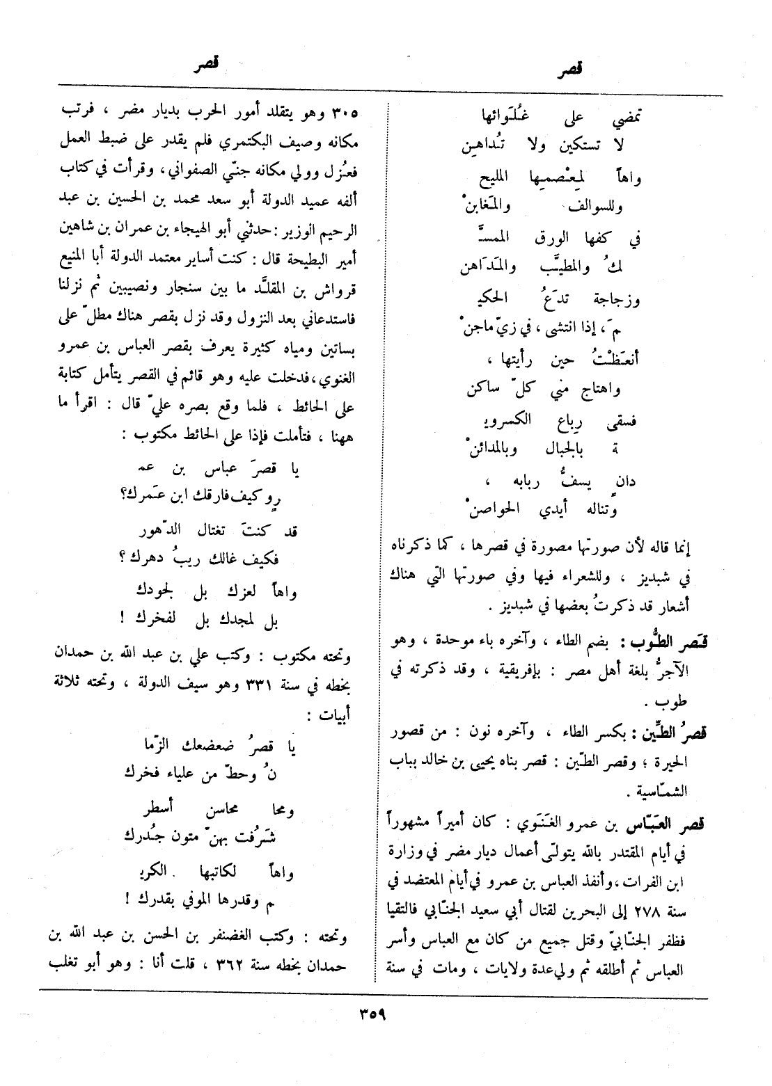 بن عمرو الغنوي: كان أميرا مشهورا في أيام المقتدر بالله يتولّى أعمال ديار مضر في وزارة ابن الفرات، وأنفذ العباس بن عمرو في أيام المعتضد في سنة 278 إلى البحرين لقتال أبي سعيد الجنّابي فالتقيا فظفر الجنّابيّ وقتل جميع من كان مع العباس وأسر العباس ثم أطلقه ثم ولي عدة ولايات، ومات في سنة 305 وهو يتقلد أمور الحرب بديار مضر، فرتب مكانه وصيف البكتمري فلم يقدر على ضبط العمل فعزل وولي مكانه جنّي الصفواني، وقرأت في كتاب ألفه عميد الدولة أبو سعد محمد بن الحسين بن عبد الرحيم الوزير: حدثني أبو الهيجاء بن عمران بن شاهين أمير البطيحة قال: كنت أساير معتمد الدولة أبا المنيع قرواش بن المقلّد ما بين سنجار ونصيبين ثم نزلنا فاستدعاني بعد النزول وقد نزل بقصر هناك مطلّ على بساتين ومياه كثيرة يعرف بقصر العباس بن عمرو الغنوي، فدخلت عليه وهو قائم في القصر يتأمل كتابة على الحائط، فلما وقع بصره عليّ قال: اقرأ ما ههنا، فتأملت فإذا على الحائط مكتوب: