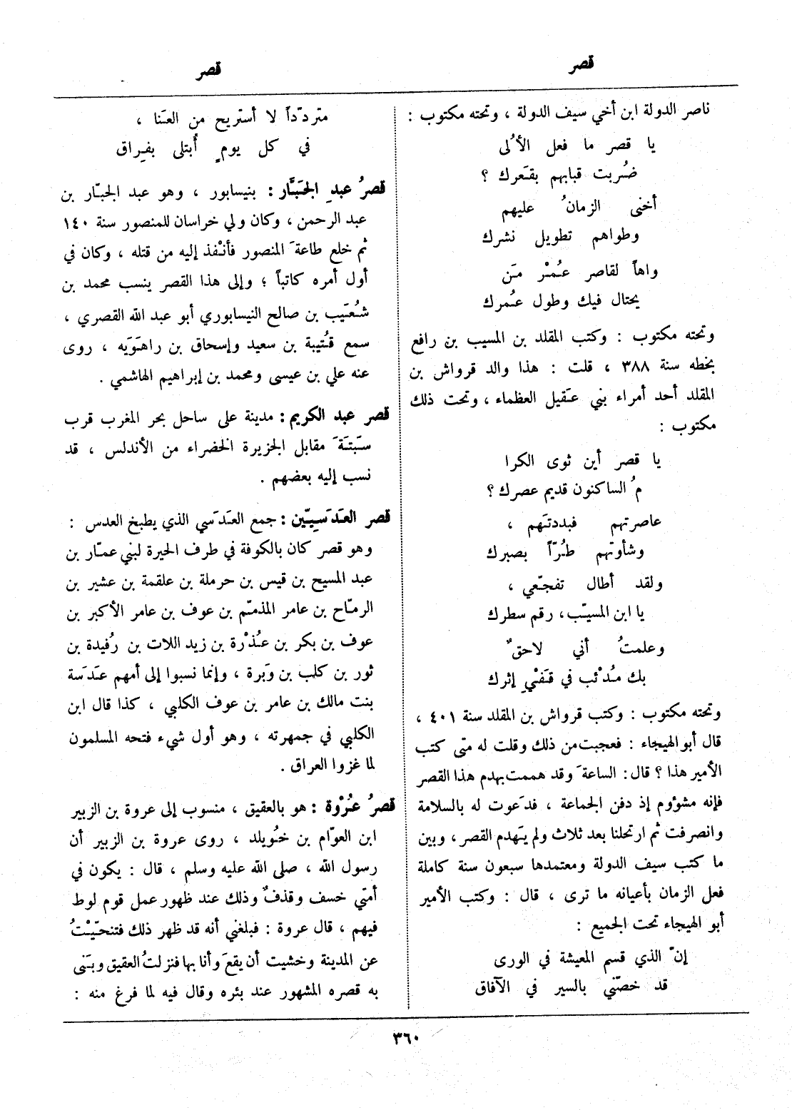 وتحته مكتوب: وكتب قرواش بن المقلد سنة 401، قال أبو الهيجاء: فعجبت من ذلك وقلت له متى كتب الأمير هذا؟ قال: الساعة وقد هممت بهدم هذا القصر فإنه مشؤوم إذ دفن الجماعة، فدعوت له بالسلامة وانصرفت ثم ارتحلنا بعد ثلاث ولم يهدم القصر، وبين ما كتب سيف الدولة ومعتمدها سبعون سنة كاملة فعل الزمان بأعيانه ما ترى، قال: وكتب الأمير أبو الهيجاء تحت الجميع: