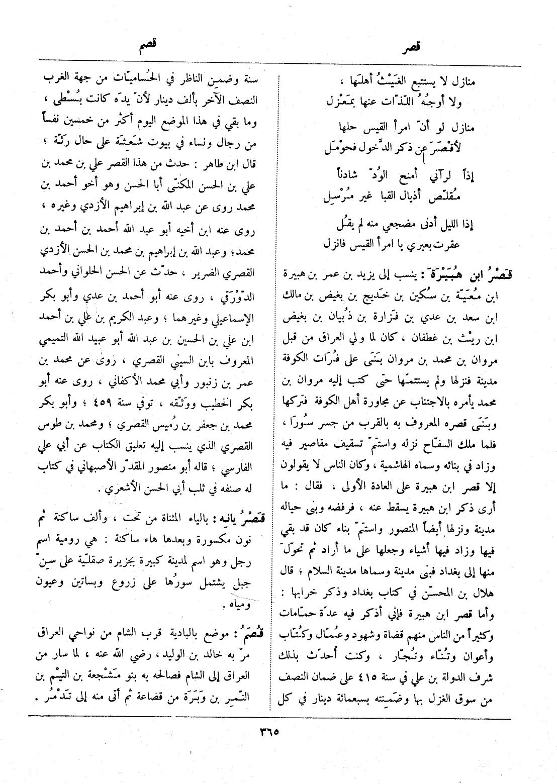 وأما قصر ابن هبيرة فإني أذكر فيه عدّة حمّامات وكثيرا من الناس منهم قضاة وشهود وعمّال وكتّاب وأعوان وتنّاء وتجّار، وكنت أحدّث بذلك شرف الدولة بن علي في سنة 415 على ضمان النصف من سوق الغزل بها وضمنته بسبعمائة دينار في كل سنة وضمن الناظر في الحساميّات من جهة الغرب النصف الآخر بألف دينار لأنّ يده كانت بسطى، وما بقي في هذا الموضع اليوم أكثر من خمسين نفسا من رجال ونساء في بيوت شعثة على حال رثّة، قال ابن طاهر: حدث من هذا القصر علي بن محمد بن علي بن الحسن المكنّى أبا الحسن وهو أخو أحمد بن محمد روى عن عبد الله بن إبراهيم الأزدي وغيره، روى عنه ابن أخيه أبو عبد الله أحمد بن أحمد بن محمد، وعبد الله بن إبراهيم بن محمد بن الحسن الأزدي القصري الضرير، حدّث عن الحسن الحلواني وأحمد الدّورقي، روى عنه أبو أحمد بن عدي وأبو بكر الإسماعيلي وغيرهما، وعبد الكريم بن علي بن أحمد ابن علي بن الحسين بن عبد الله أبو عبيد الله التميمي المعروف بابن السيني القصري، روى عن محمد بن عمر بن زنبور وأبي محمد الأكفاني، روى عنه أبو بكر الخطيب ووثّقه، توفي سنة 459، وأبو بكر محمد بن جعفر بن رميس القصري، ومحمد بن طوس القصري الذي ينسب إليه تعليق الكتاب عن أبي علي الفارسي، قاله أبو منصور المقدّر الأصبهاني في كتاب له صنفه في ثلب أبي الحسن الأشعري.