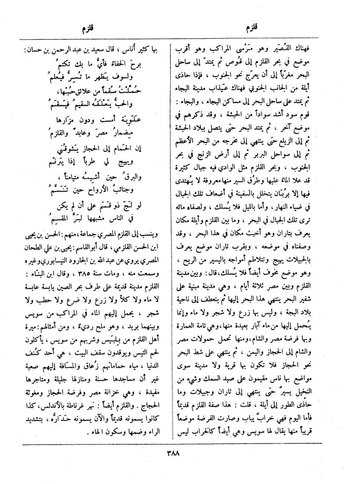 قوم سود أشد سوادا من الحبشة، وقد ذكرهم في موضع آخر، ثم يمتد البحر حتى يتصل ببلاد الحبشة ثم إلى الزيلع حتى ينتهي إلى مخرجه من البحر الأعظم ثم إلى سواحل البربر ثم إلى أرض الزنج في بحر الجنوب، وبحر القلزم مثل الوادي فيه جبال كثيرة قد علا الماء عليها وطرق السير منها معروفة لا يهتدى فيها إلا بربّان يتخلل بالسفينة في أضعاف تلك الجبال في ضياء النهار، وأما بالليل فلا يسلك، ولصفاء مائه ترى تلك الجبال في البحر، وما بين القلزم وأيلة مكان يعرف بتاران وهو أخبث مكان في هذا البحر، وقد وصفناه في موضعه، وبقرب تاران موضع يعرف بالجبيلات يهيج وتتلاطم أمواجه باليسير من الريح، وهو موضع مخوف أيضا فلا يسلك، قال: وبين مدينة القلزم وبين مصر ثلاثة أيام، وهي مدينة مبنية على شفير البحر ينتهي هذا البحر إليها ثم ينعطف إلى ناحية بلاد البجة، وليس بها زرع ولا شجر ولا ماء وإنما يحمل إليها من ماء آبار بعيدة منها، وهي تامة العمارة وبها فرضة مصر والشام، ومنها تحمل حمولات مصر والشام إلى الحجاز واليمن، ثم ينتهي على شط البحر نحو الحجاز فلا تكون بها قرية ولا مدينة سوى مواضع بها ناس مقيمون على صيد السمك وشيء من النخيل يسير حتى ينتهي إلى تاران وجبيلات وما حاذى الطور إلى أيلة، قلت: هذا صفة القلزم قديما فأما اليوم فهي خراب يباب وصارت الفرضة موضعا قريبا منها يقال لها سويس وهي أيضا كالخراب ليس بها كثير أناس، قال سعيد بن عبد الرحمن بن حسان: