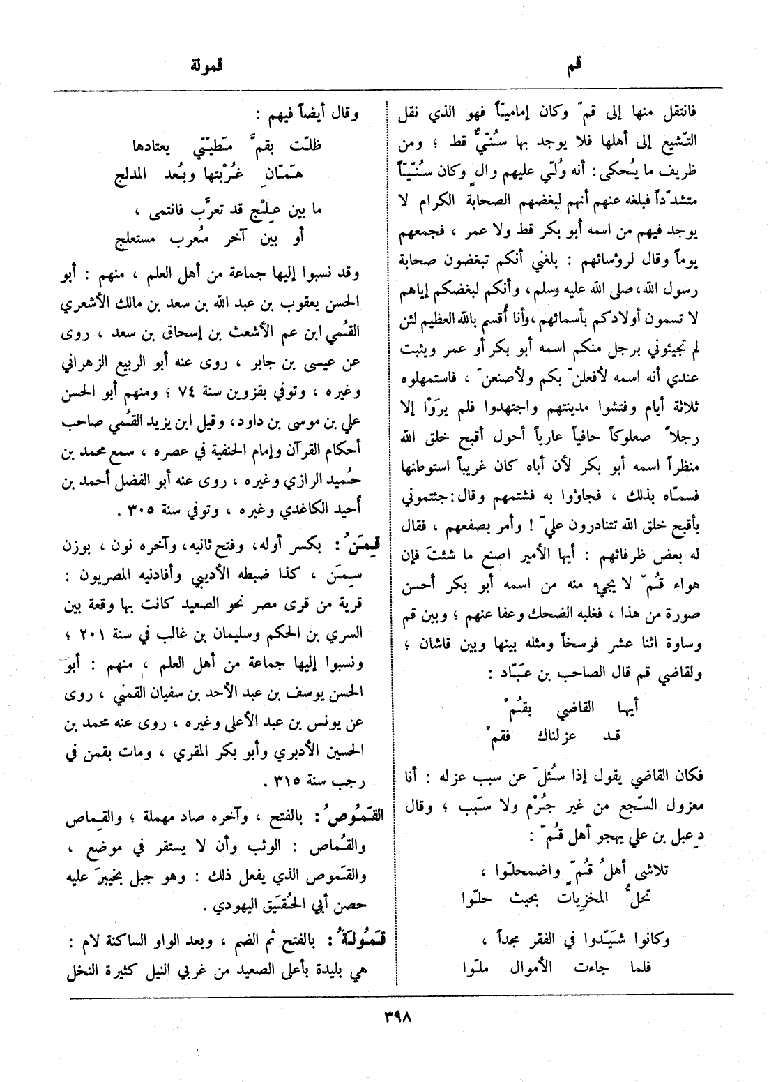 فانتقل منها إلى قمّ وكان إماميّا فهو الذي نقل التّشيع إلى أهلها فلا يوجد بها سنّيّ قط، ومن ظريف ما يحكى: أنه ولّي عليهم وال وكان سنّيّا متشدّدا فبلغه عنهم أنهم لبغضهم الصحابة الكرام لا يوجد فيهم من اسمه أبو بكر قط ولا عمر، فجمعهم يوما وقال لرؤسائهم: بلغني أنكم تبغضون صحابة رسول الله، صلى الله عليه وسلم، وأنكم لبغضكم إياهم لا تسمون أولادكم بأسمائهم، وأنا أقسم بالله العظيم لئن لم تجيئوني برجل منكم اسمه أبو بكر أو عمر ويثبت عندي أنه اسمه لأفعلنّ بكم ولأصنعنّ، فاستمهلوه ثلاثة أيام وفتشوا مدينتهم واجتهدوا فلم يروا إلا رجلا صعلوكا حافيا عاريا أحول أقبح خلق الله منظرا اسمه أبو بكر لأن أباه كان غريبا استوطنها فسمّاه بذلك، فجاؤوا به فشتمهم وقال: جئتموني بأقبح خلق الله تتنادرون عليّ! وأمر بصفعهم، فقال له بعض ظرفائهم: أيها الأمير اصنع ما شئت فإن هواء قمّ لا يجيء منه من اسمه أبو بكر أحسن صورة من هذا، فغلبه الضحك وعفا عنهم، وبين قم وساوة اثنا عشر فرسخا ومثله بينها وبين قاشان، ولقاضي قم قال الصاحب بن عبّاد: