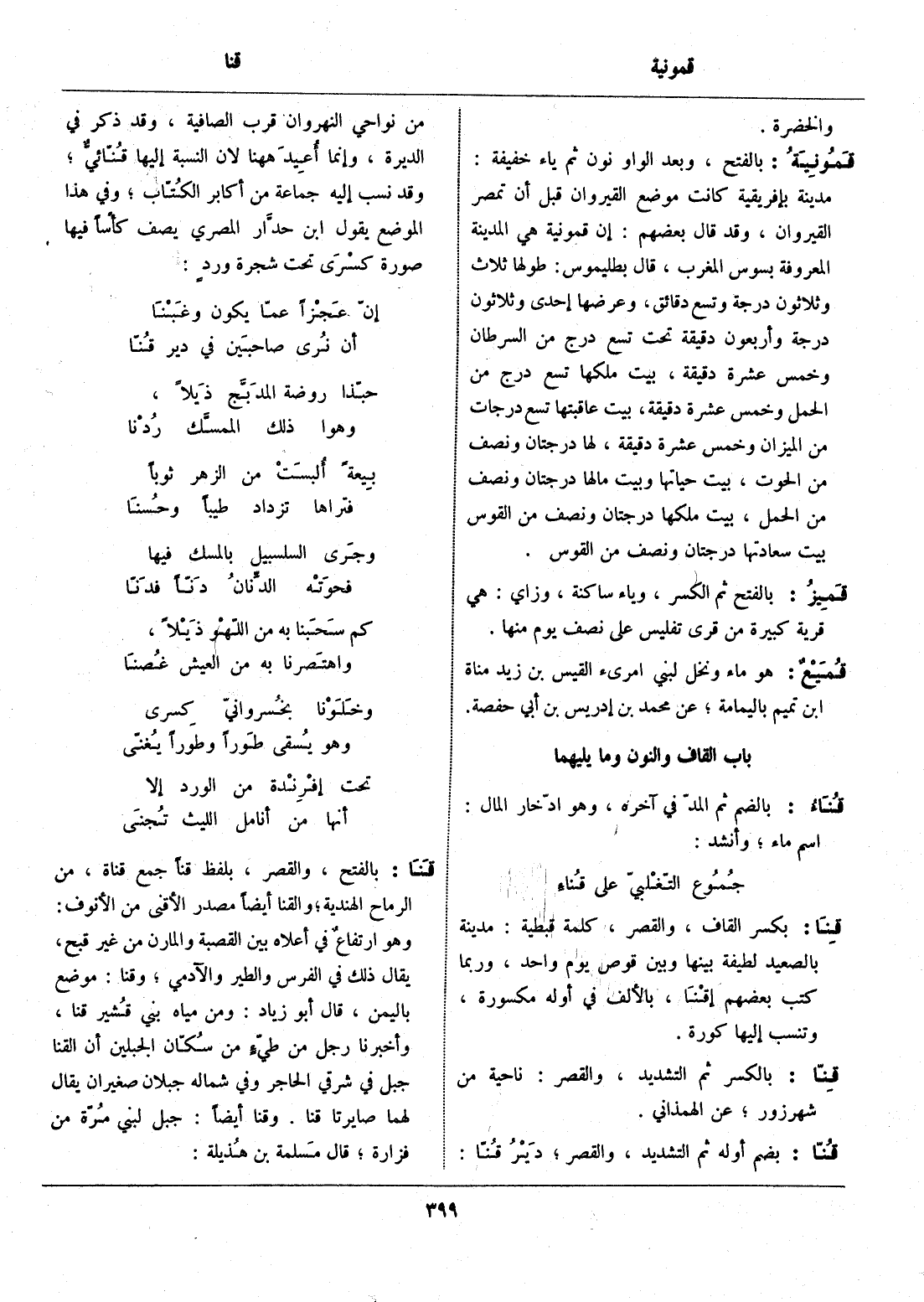 وهو ارتفاع في أعلاه بين القصبة والمارن من غير قبح، يقال ذلك في الفرس والطير والآدمي، وقنا: موضع باليمن، قال أبو زياد: ومن مياه بني قشير قنا، وأخبرنا رجل من طيّء من سكّان الجبلين أن القنا جبل في شرقي الحاجر وفي شماله جبلان صغيران يقال لهما صايرتا قنا. وقنا أيضا: جبل لبني مرّة من فزارة، قال مسلمة بن هذيلة: