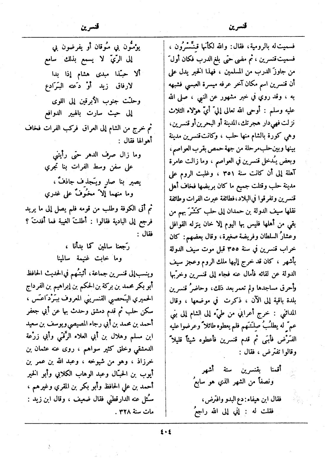فسميت له بالرومية، فقال: والله لكأنها قنّسرون، فسميت قنسرين، ثم مضى حتى بلغ الدرب فكان أول من جاوز الدرب من المسلمين، فهذا الخبر يدل على أن قنسرين اسم مكان آخر عرفه ميسرة العبسي فشبهه به، وقد روي في خبر مشهور عن النبي، صلى الله عليه وسلم: أوحى الله تعالى إليّ أيّ هؤلاء الثلاث نزلت فهي دار هجرتك، المدينة أو البحرين أو قنسرين، وهي كورة بالشام منها حلب، وكانت قنسرين مدينة بينها وبين حلب مرحلة من جهة حمص بقرب العواصم، وبعض يدخل قنسرين في العواصم، وما زالت عامرة آهلة إلى أن كانت سنة 351، وغلبت الروم على مدينة حلب وقتلت جميع ما كان بربضها فخاف أهل قنسرين وتفرقوا في البلاد، فطائفة عبرت الفرات وطائفة نقلها سيف الدولة بن حمدان إلى حلب كثّر بهم من بقي من أهلها فليس بها اليوم إلا خان ينزله القوافل وعشار السلطان وفريضة صغيرة، وقال بعضهم: كان خراب قنسرين في سنة 355 قبل موت سيف الدولة بأشهر، كان قد خرج إليها ملك الروم وعجز سيف الدولة عن لقائه فأمال عنه فجاء إلى قنسرين وخرّبها وأحرق مساجدها ولم تعمر بعد ذلك، وحاضر قنسرين بلدة باقية إلى الآن، ذكرت في موضعها، وقال المدائني: خرج أعرابي من طيّء إلى الشام إلى بني عمّ له يطلب صلتهم فلم يعطوه طائلا وعرضوا عليه الفرض فأبى ثم قدم قنسرين فأعطوه شيئا قليلا وقالوا تفترض، فقال: