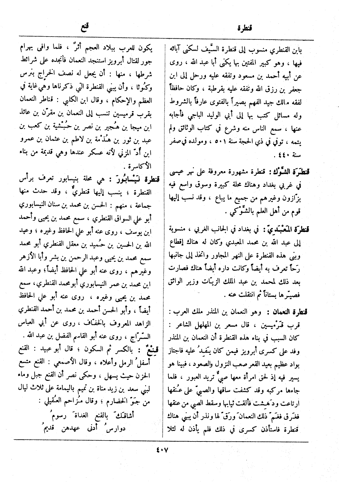 هي محلة بنيسابور تعرف برأس القنطرة، ينسب إليها قنطريّ، وقد حدث منها جماعة، منهم: الحسن بن محمد بن سنان النيسابوري أبو علي السواق القنطري، سمع محمد بن يحيى وأحمد ابن يوسف، روى عنه أبو علي الحافظ وغيره، وعبد الله بن الحسين بن حميد بن معقل القنطري أبو محمد سمع محمد بن يحيى وعبد الرحمن بن بشر وأبا الأزهر وغيرهم، روى عنه أبو علي الحافظ أيضا، وعبد الله ابن محمد بن عمر النيسابوري أبو محمد القنطري، سمع محمد بن يحيى وغيره، روى عنه أبو علي الحافظ أيضا، وأبو الحسن أحمد بن محمد بن أحمد القنطري الزاهد المعروف بالخفّاف، روى عن أبي العباس السّرّاج، روى عنه أبو القاسم الفضل بن عبد الله.