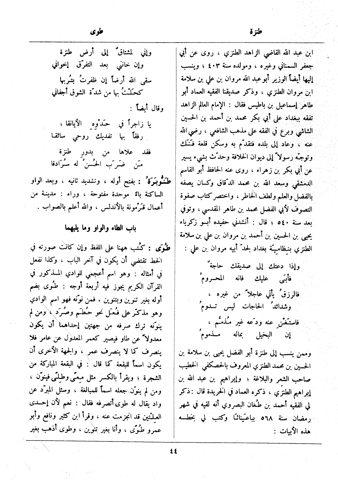 ابن عبد الله القاضي الزاهد الطنزي، روى عن أبي جعفر السمناني وغيره، ومولده سنة 403، وينسب إليها أيضا الوزير أبو عبد الله مروان بن علي بن سلامة ابن مروان الطنزي، وذكر صديقنا الفقيه العماد أبو طاهر إسماعيل بن باطيس فقال: الإمام العالم الزاهد تفقه ببغداد على أبي بكر محمد بن أحمد بن الحسين الشاشي وبرع في الفقه على مذهب الشافعي، رضي الله عنه، وعاد إلى بلده فتقدّم به وسكن قلعة فنك وتوجّه رسولا إلى ديوان الخلافة وحدّث بشيء يسير عن أبي بكر بن زهراء، روى عنه الحافظ أبو القاسم الدمشقي وسعد الله بن محمد الدّقاق وكان يصفه بالفضل والعلم ولطف الخاطر، واختصر كتاب صفوة التصوف لأبي الفضل محمد بن طاهر المقدسي، وتوفي بعد سنة 540، قال: أنشدني حفيده أبو زكرياء يحيى بن الحسين بن أحمد بن مروان بن علي بن سلامة الطنزي بنظاميّة بغداد لجدّ أبيه مروان بن علي: