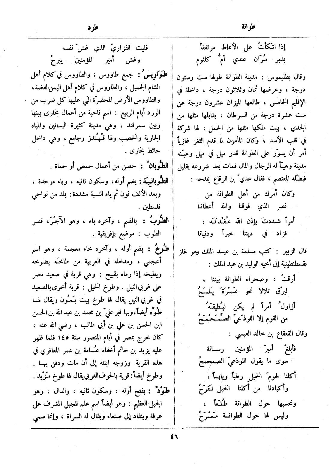 وقال بطليموس: مدينة الطوانة طولها ست وستون درجة، وعرضها ثمان وثلاثون درجة، داخلة في الإقليم الخامس، طالعها الميزان عشرون درجة عن ست عشرة درجة من السرطان، يقابلها مثلها من الجدي، بيت ملكها مثلها من الحمل، لها شركة في قلب الأسد، وكان المأمون لما قدم الثغر غازيا أمر أن يسوّر على الطوانة قدر ميل في ميل وعيّنه مدينة وهيّأ له الرجال والمال فمات بعد شروعه بقليل فبطّله المعتصم، فقال عديّ بن الرقاع يمدحه: